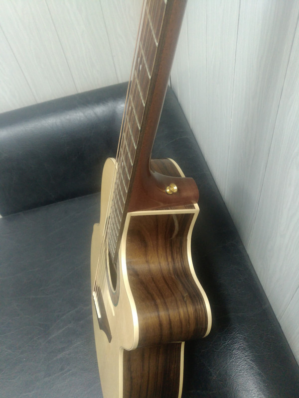 Ширина грифа на первом ладу -- 43 мм. Крепление грифа на 14-м ладу. Струны ещё свежие -- Ernie Ball 11-52 фосфор-бронза.
