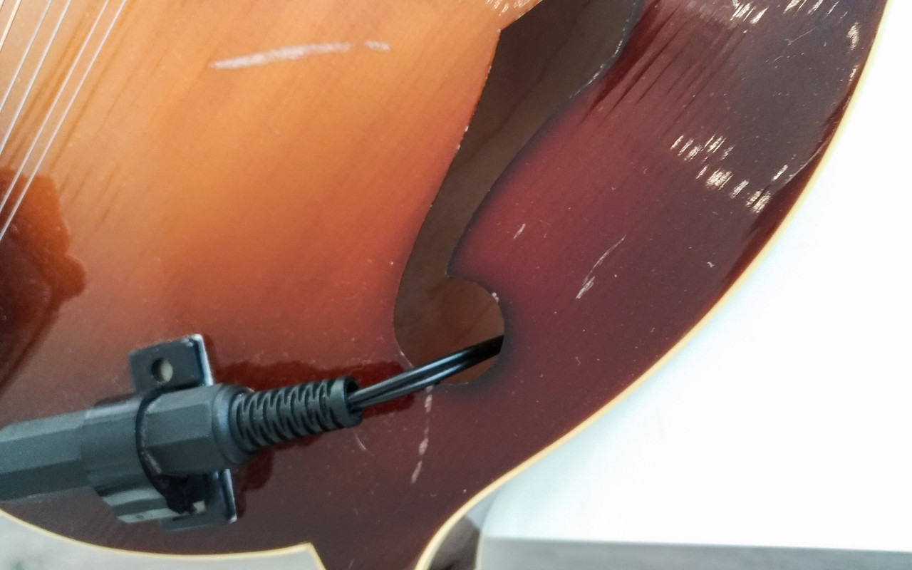 Внутри стоит пьеза K&K Twin Spot. Лады ровные, мандолина отлично отстроена, играть удобно и легко. Из других обновок -- бридж Cumberland Acoustic (