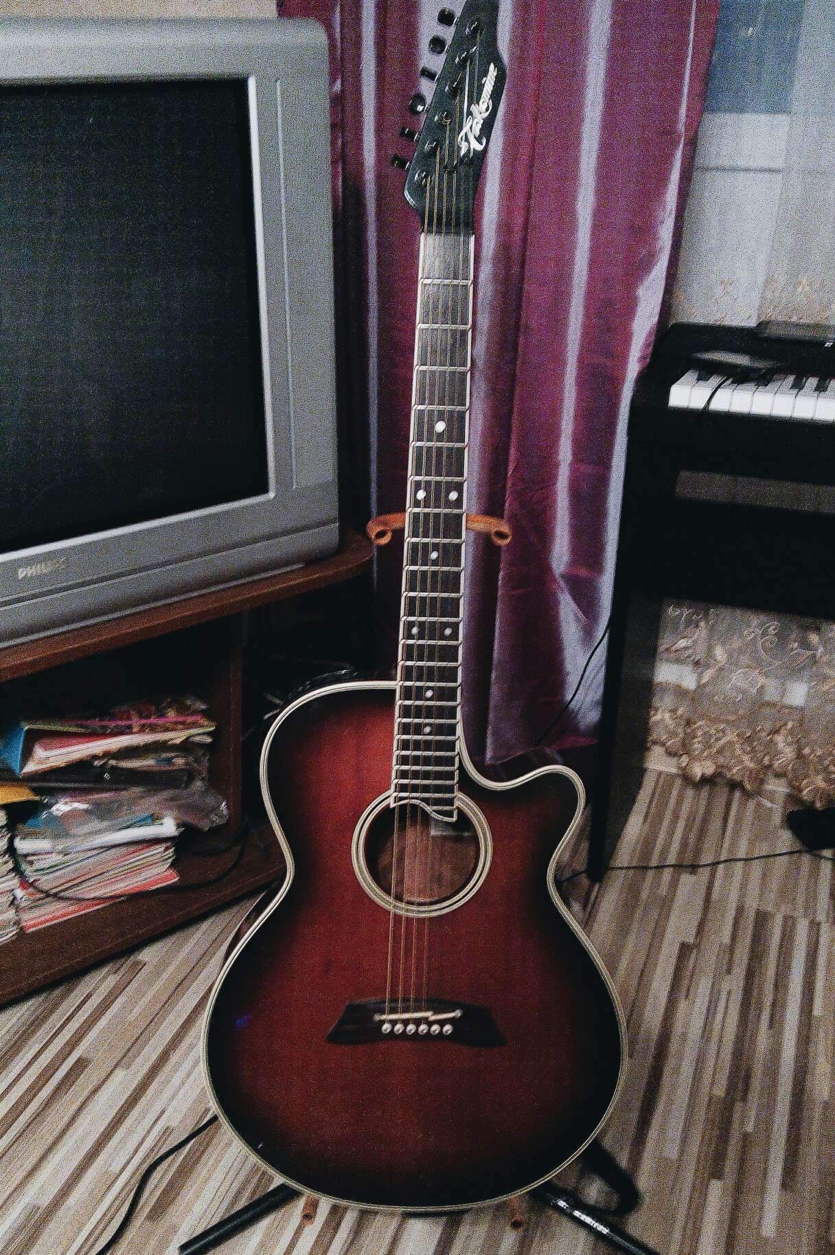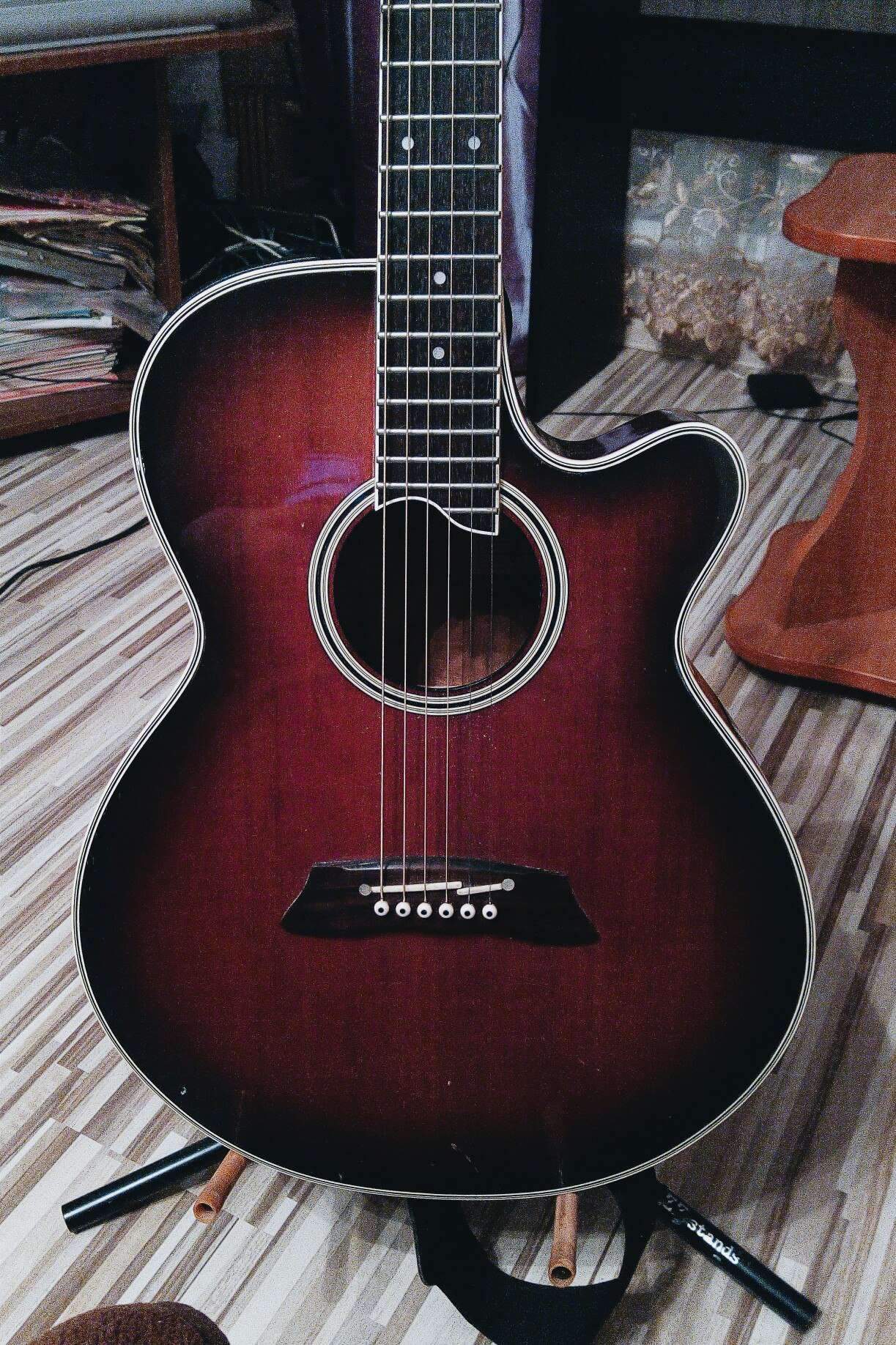 Передняя дека из ели, задняя и обечайки – махагон. Стоит родной преамп: трехполосный эквалайзер и громкость.