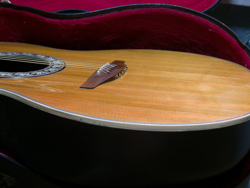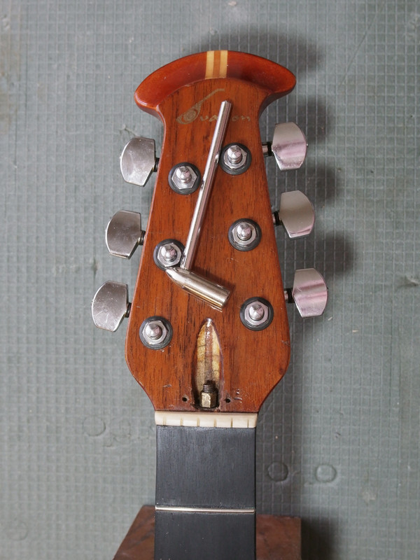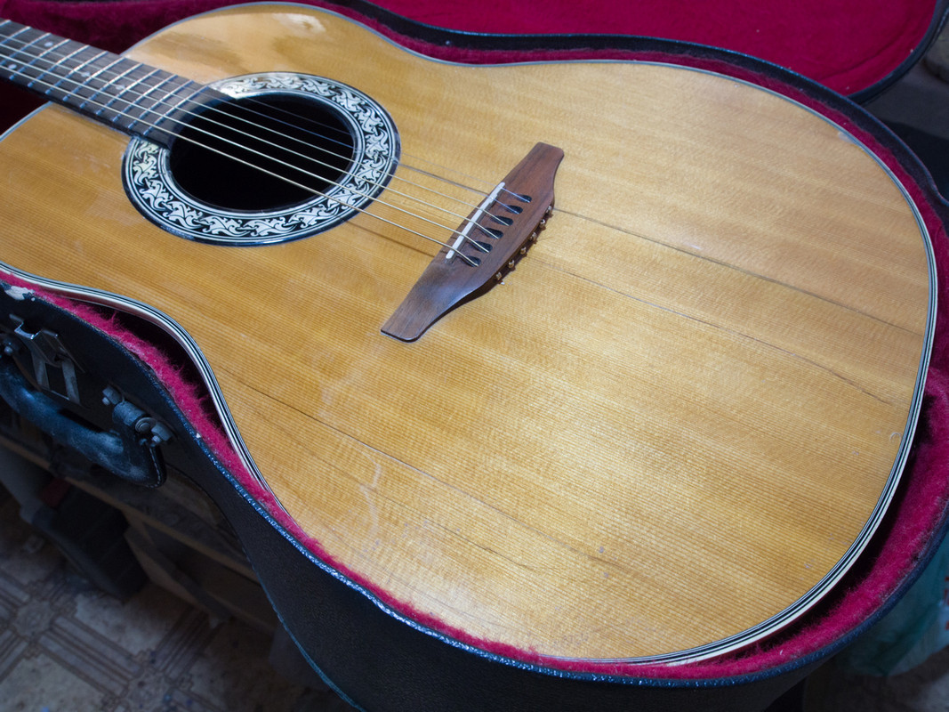 Дека выглядит страшновато. Но, во-первых, с таким ремонтом гитара пришла из Калифорнии и что-то расковыривать и переделывать дорого и неоправданно. Во-вторых, за те 5 лет, что гитара была у меня, с ней ничего не произошло и не поменялось. То есть – это её стабильное состояние.