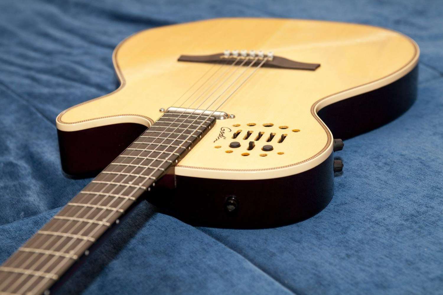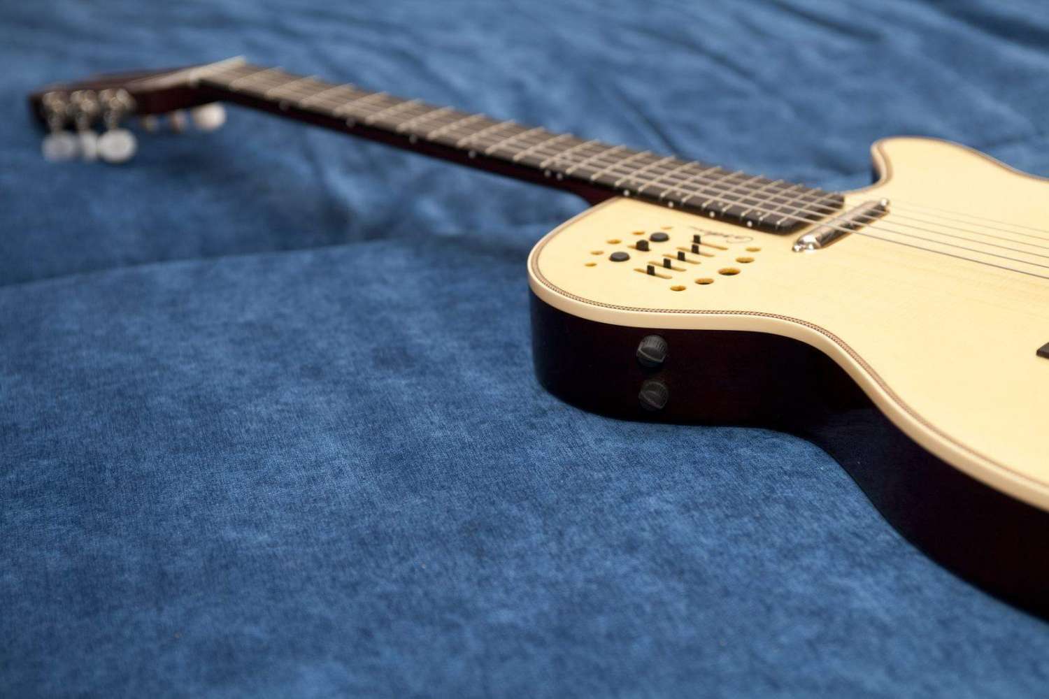 Вкратце о гитаре - корпус и гриф красное дерево, накладка - черное дерево. Элетромагнитный датчик сеймур дункан в неке, в бридже комбинированный пьезо/миди-датчик RMC, соответственно 3 выхода. Огромное количество вариантов звучания.
