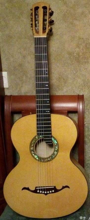 Дека ель кавказская , корпус клен, накладка грифа эбен, гриф красное дерево. Гриф на винте (венская конструкция). Ширина грифа вверху 54 мм. Мензура 650 мм. Под нейлоновые струны.