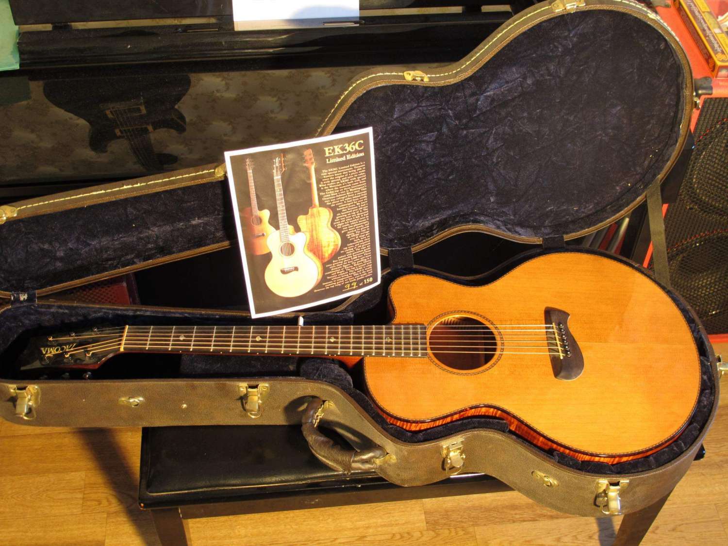 Продаётся топовая аккустика Tacoma EK36C. Материал - Гавайское коа. Накладка и бридж из чёрного дерева. Топ из 1500-летнего кедра. Сногсшибательный звук. Никаких вырезов под электронику (для меня это было очень важным фактором при покупке), живая дека резонирует полностью. Это реально ЛУЧШАЯ акустика, на которой я когда-либо играл! Переслушал огромную кучу гитар, Такамины и Тейлоры идут строем лесом), Ovation туда же. Единственная гитара, которая смогла потягаться с моей - топовая Ларриви, но она стоила штук 80 по-моему.
