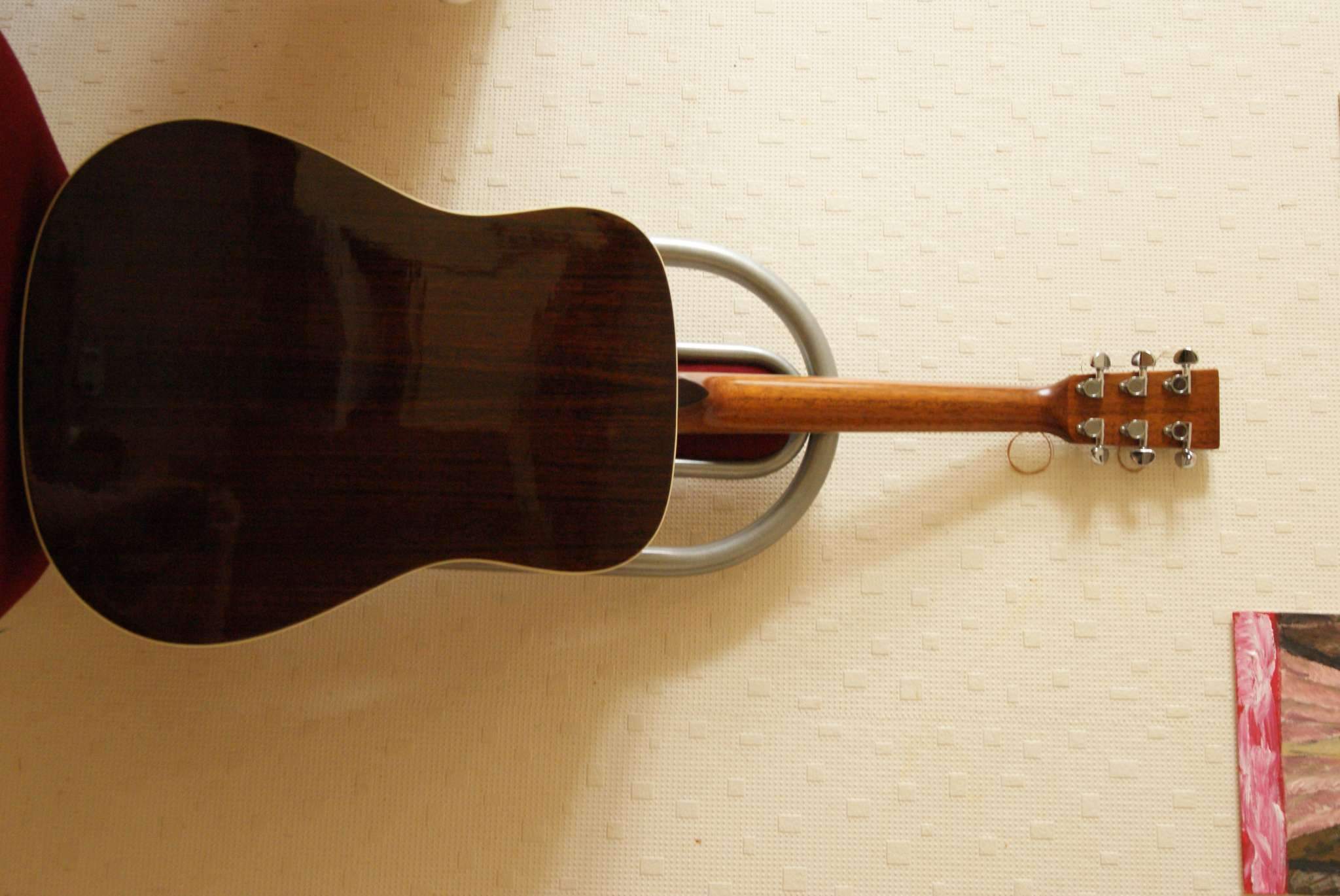 Куплена в далёком 2006 году, эксплуатрировалась нежно(включая полироль и своевременную смену струн), но не смотря на это за годы получила ряд мелких сколов лака в нижней лицевой части деки+ 1 скол на борту(подробности на фотографиях).