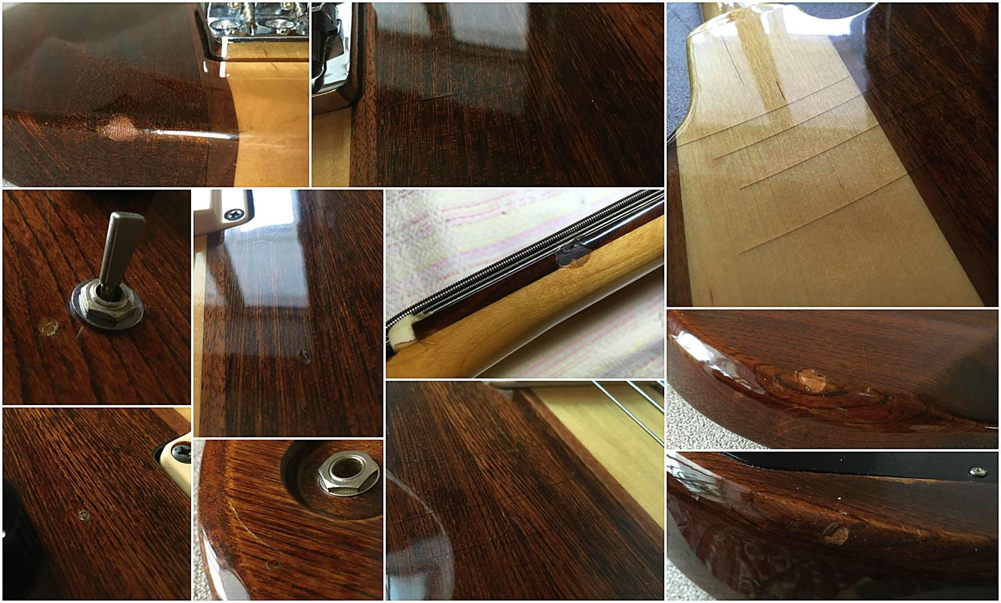 Инструмент в хорошем состоянии, технически без нареканий. Гриф и лады ровные, анкер имеет приличный запас по регулировкам в обе стороны, фурнитура без износа, прочищалась и смазывалась. Электроника функциональна, поты и свитч обслужены, дополнительно экранировался тембрблок. Косметически присутствуют недостатки в виде сколов, трещин лака и потертостей по корпусу и частично на грифе (см. фото проблемных мест).