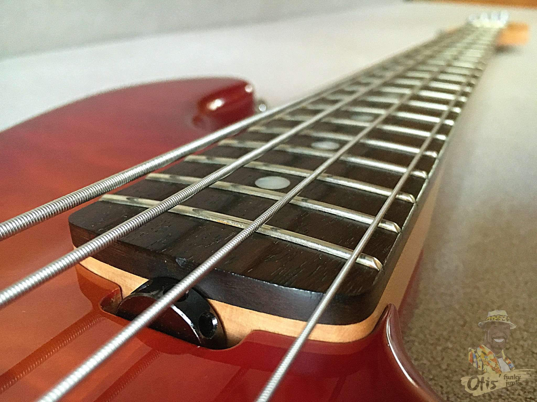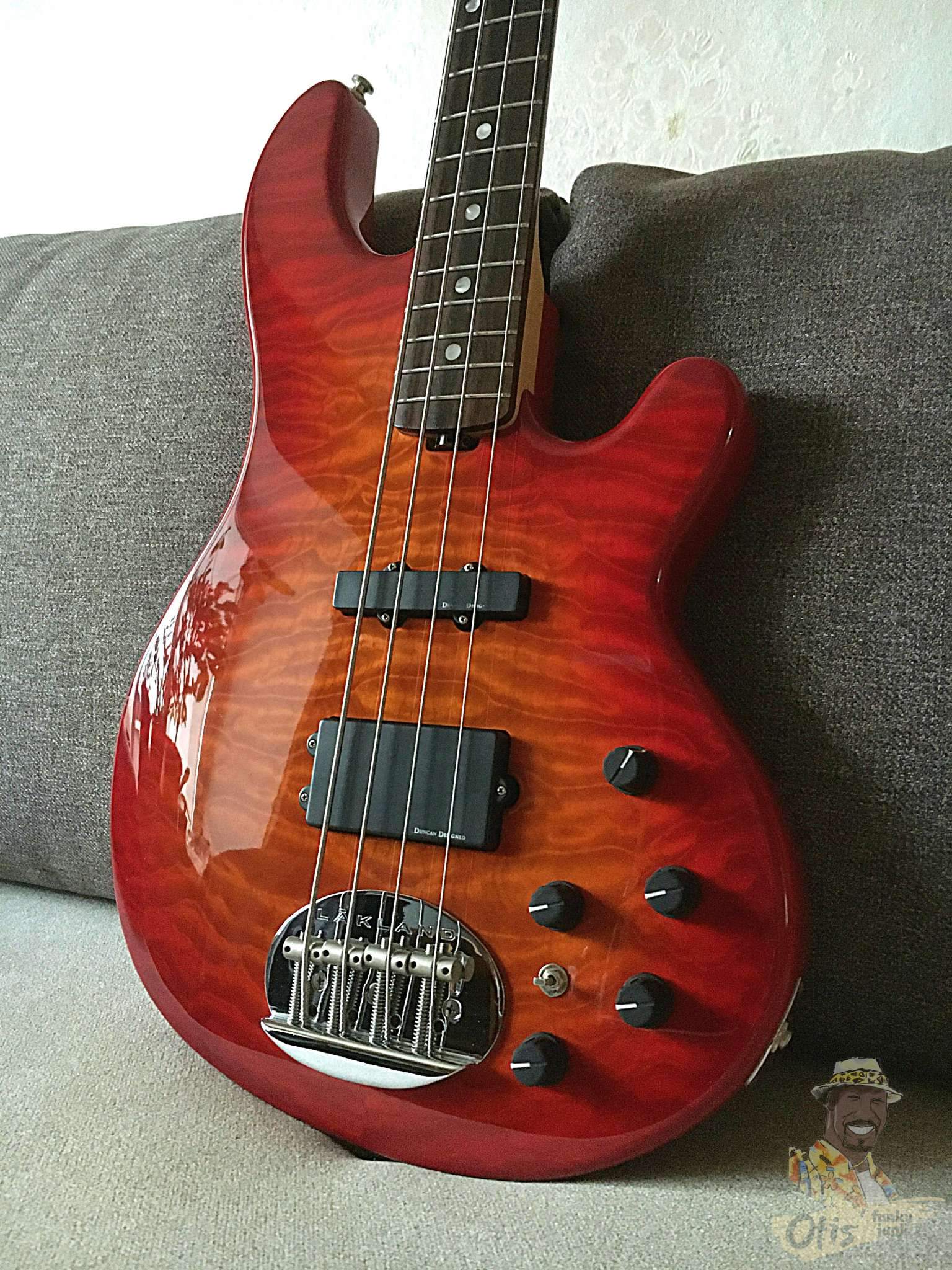 Бас полностью отстроен на свежем комплекте стальных D'Addario под низкий экшн 1,5-1,8мм над 12м ладом, струны с легкостью укладываются вниз вплоть до гитарных 1,0-1,2мм