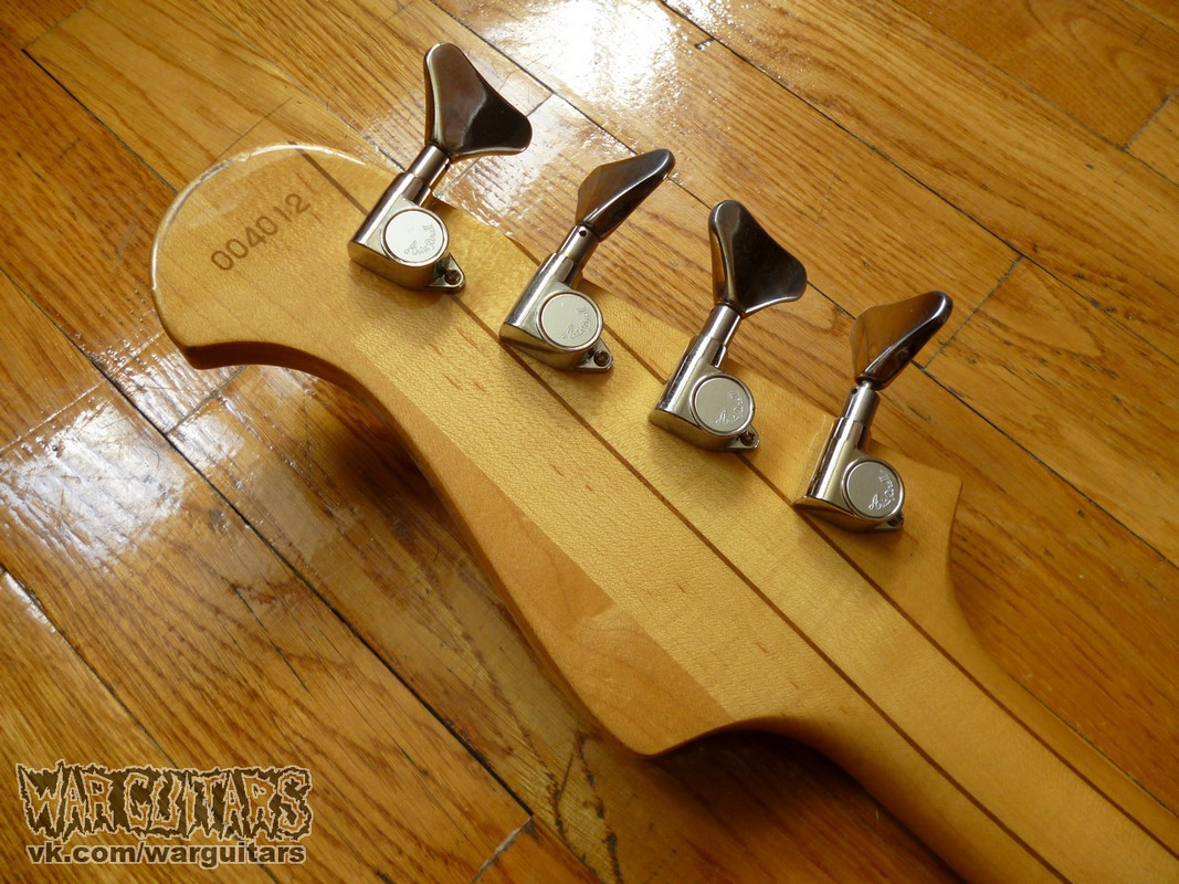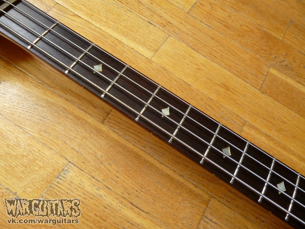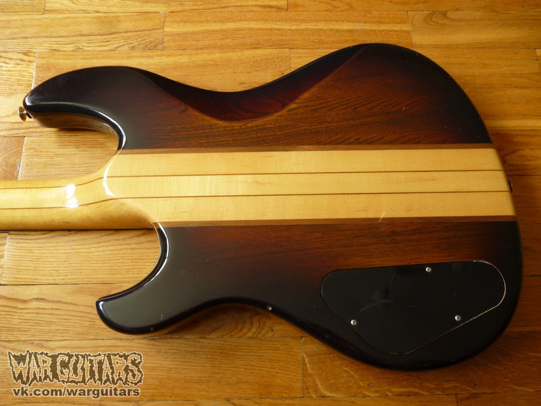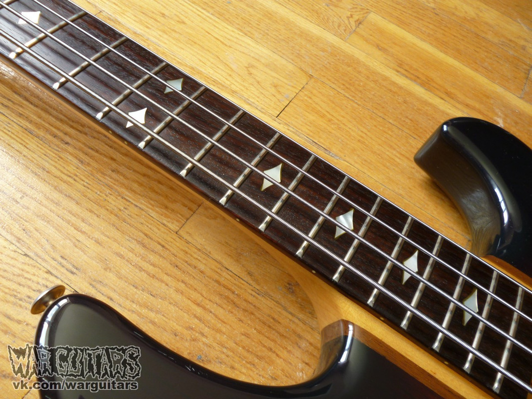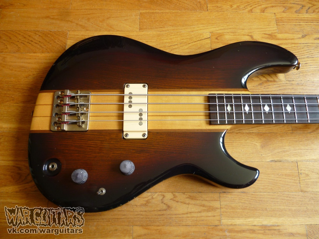 Бомбовый предтоповый (от единственного более старшего брата отличается только одним датчиком вместо двух) сквозной монстр-бас от Арии Про из ч0ткого 80-го года в крутейшей расцветке Japan Brown. Что мы имеем на борту? Ясеневая дека, пятикусковый гриф из переклейки клена и ореха с накладкой из палисандра, ромбы инкрустации из натурального перламутра, латунный порожек и единственный, но при этом очень внушительно рычащий, хамбакер с переключением режимов катушек. Солидный и взрослый бас, стоящий в одном ряду со своим знаменитым современником Ibanez Musician, например, но при этом более дешевый на вторичном рынке. Короче говоря, пушка вообще.