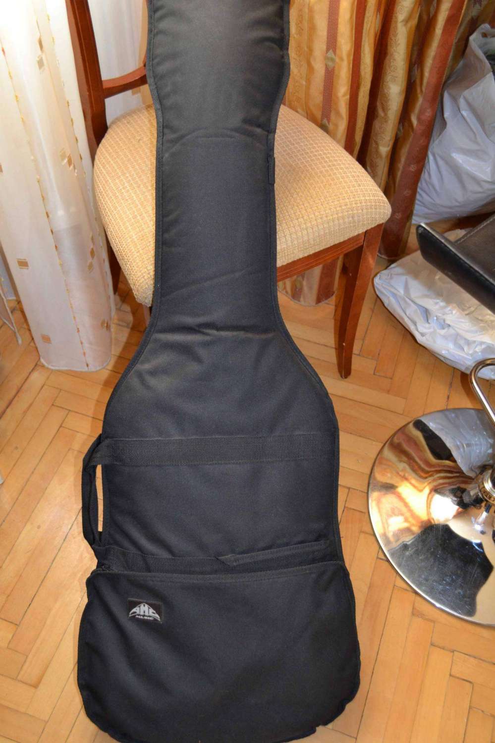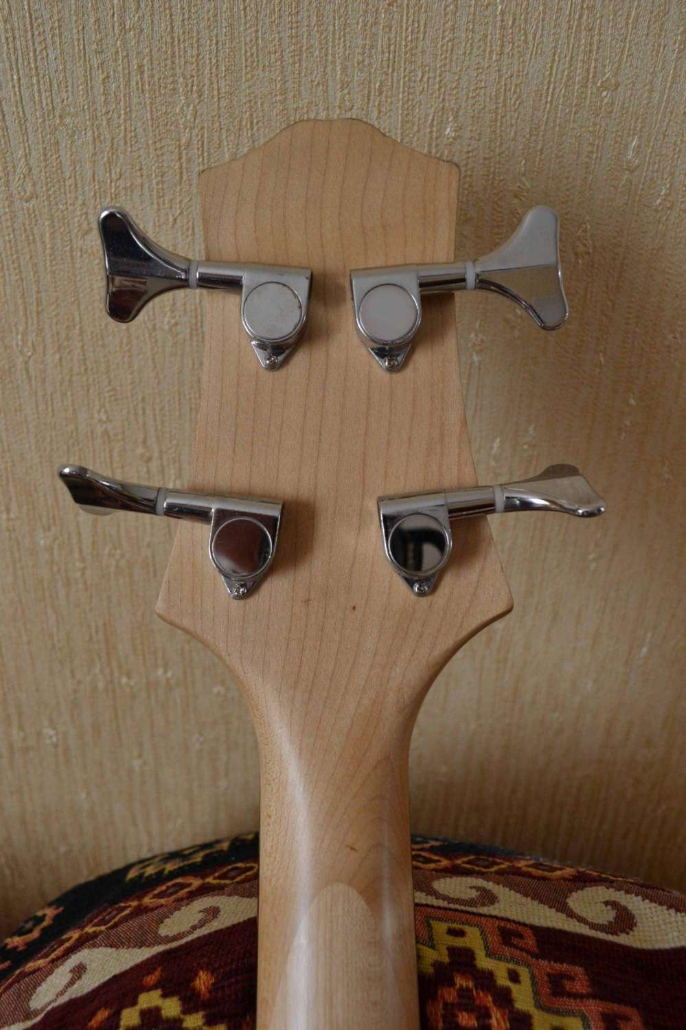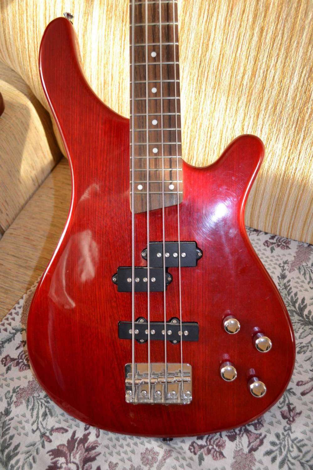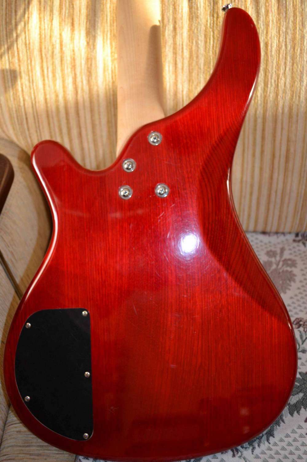 Верхний порожек баса менялся. В комплекте, помимо чехла, отдам еще один новый порожек:) На верхей деке треснул лак, но видно только, если присмотреться. На звук не влияет. Отличный инструмент для начинающего басиста.