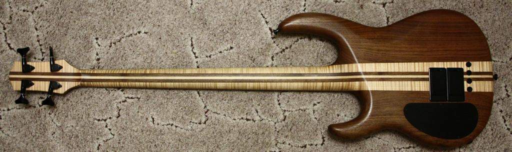 Гриф сквозной из 5 кусков (волнистый клён и орех), накладка из чёрного дерева.