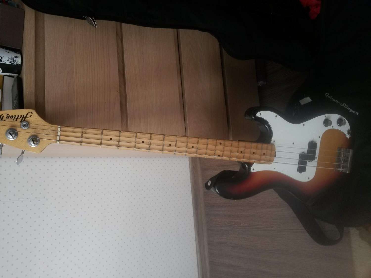 Action 80 годов,в хорошем состоянии.отстроен и ждет своего нового хозяина. ольха, шпонированная сверху и снизу то лт кленом то ли буком.звучит на уровне мекса или японца,не уступает уж точно по звуку.послушать можно в музторге.либо на вашем комбике,кабинете.