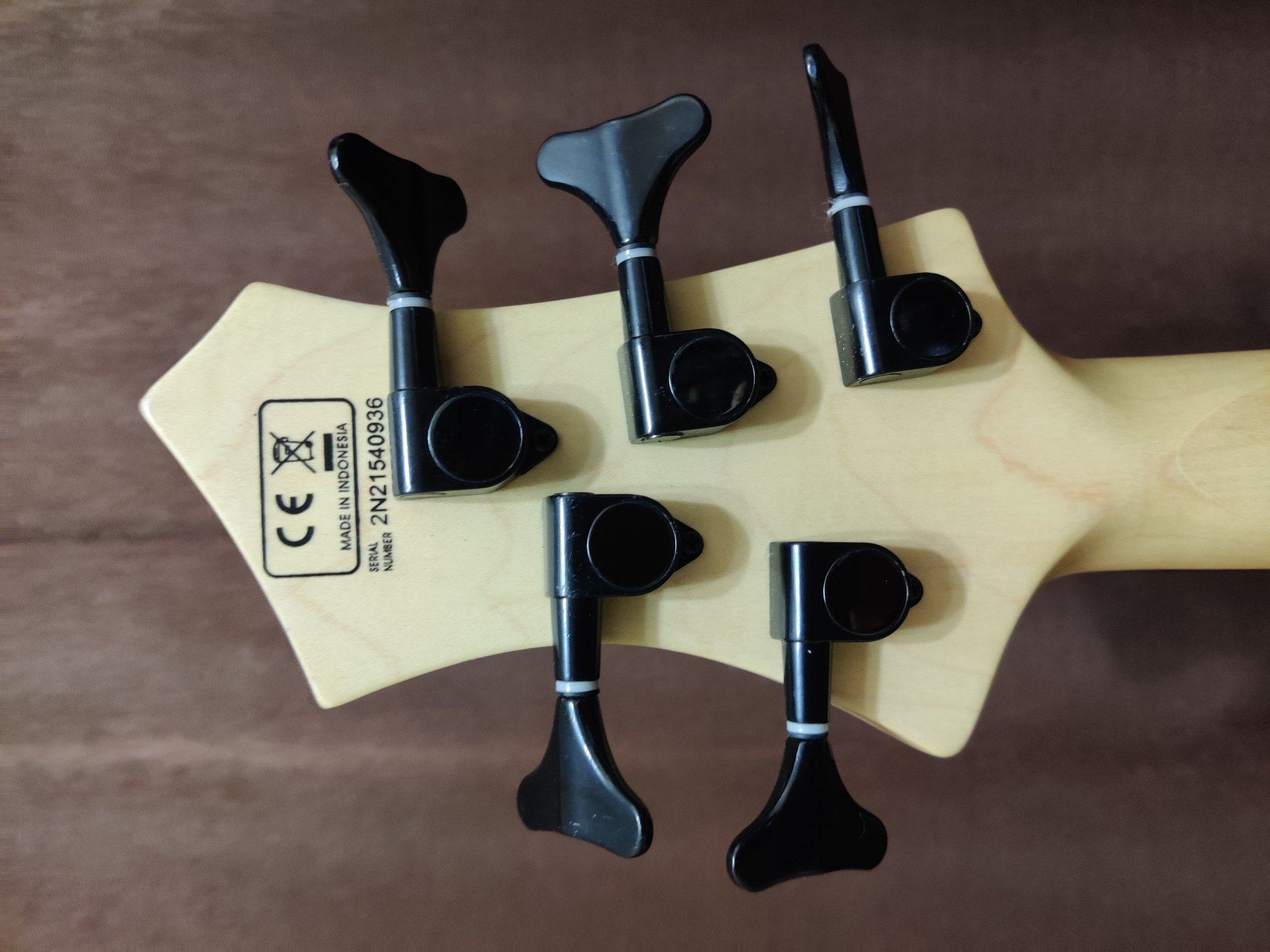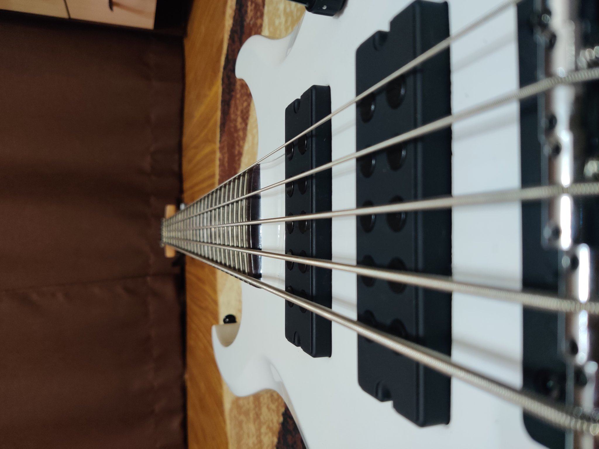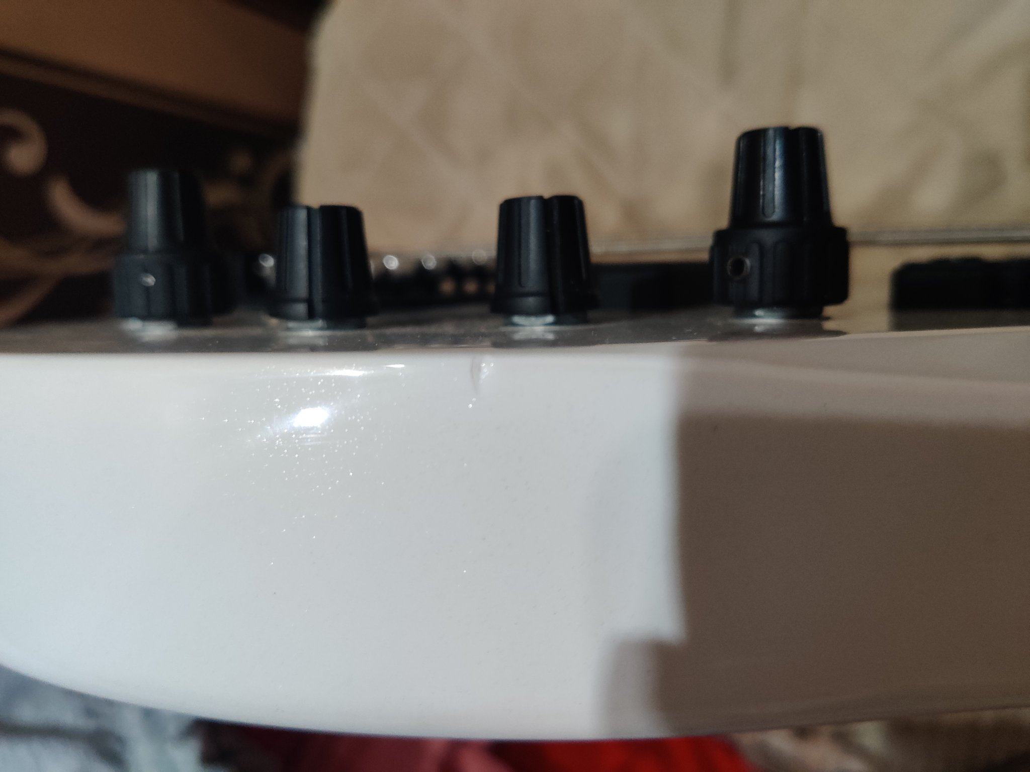 В итоге, бас использовался на 7-ми концертах (это видно по струнам, т.к. при нормальном использовании, в местах соприкосновения струн и ладов, на струнах видны следы) и с августа месяца лежит у меня дома без дела. Можно сказать, что инструмент практически новый, однозначно не разыгранный. Состояние, понятное дело, отличное, только однажды басист не вписался в дверной проем и слегка зацепил углом головки грифа дверной косяк, отколов кусочек лака (на фото видно). Никакого повреждения дерева нет, откололся именно лак, поэтому, с учетом того, что это просто белый лак, легко можно закрыть, капнув одну каплю и всё. Есть парочка малюсеньких вмятин лака на боках инструмента, они были с момента покупки, видны под определённым углом. Задние крышки в плёнках , никаких царапин на них нет (сами пленки, да, слегка подрались). Вся электроника и механика работают без проблем. Гитара в родной коробке, никакого чехла или кейса для нее не приобреталось.