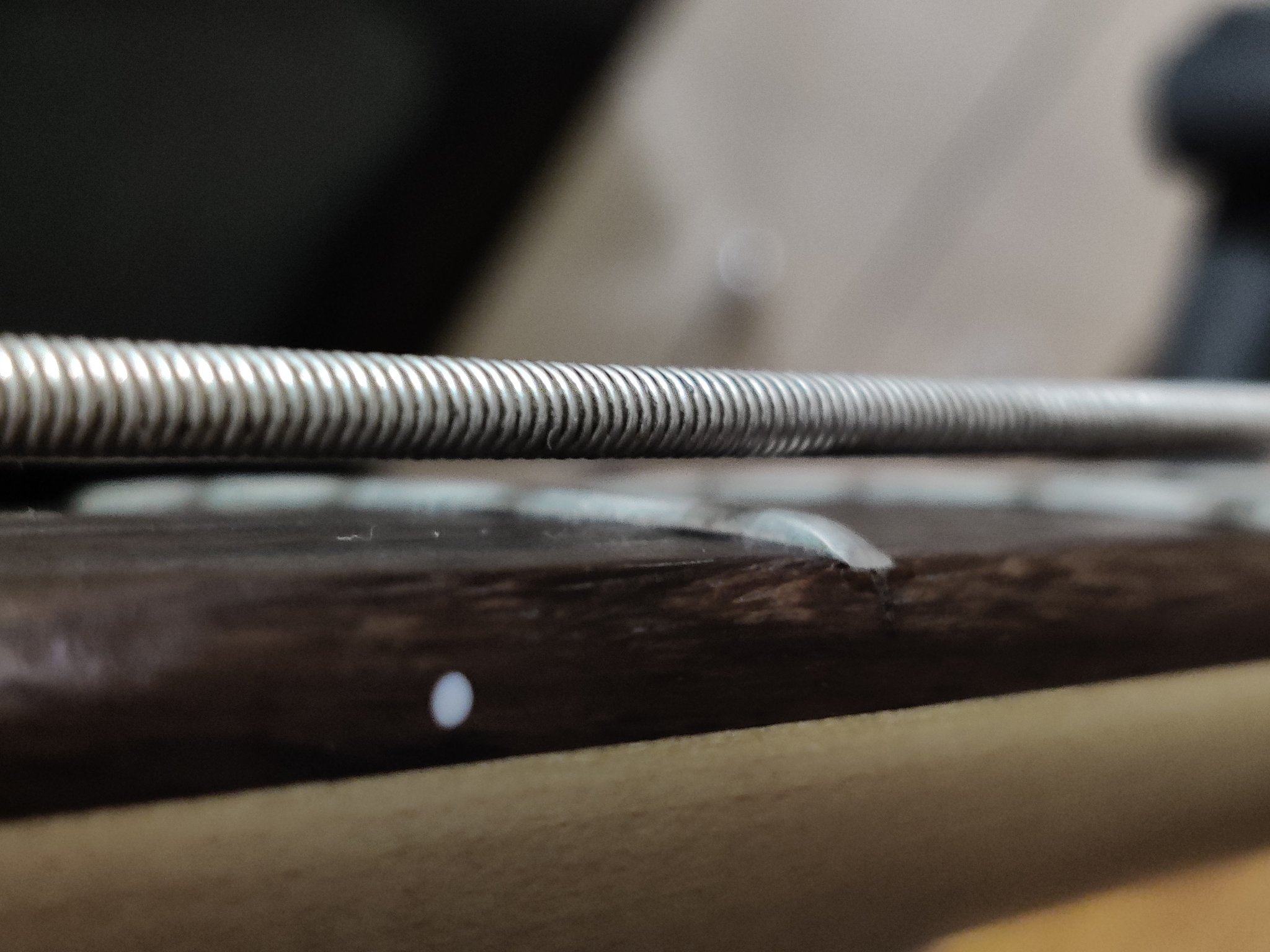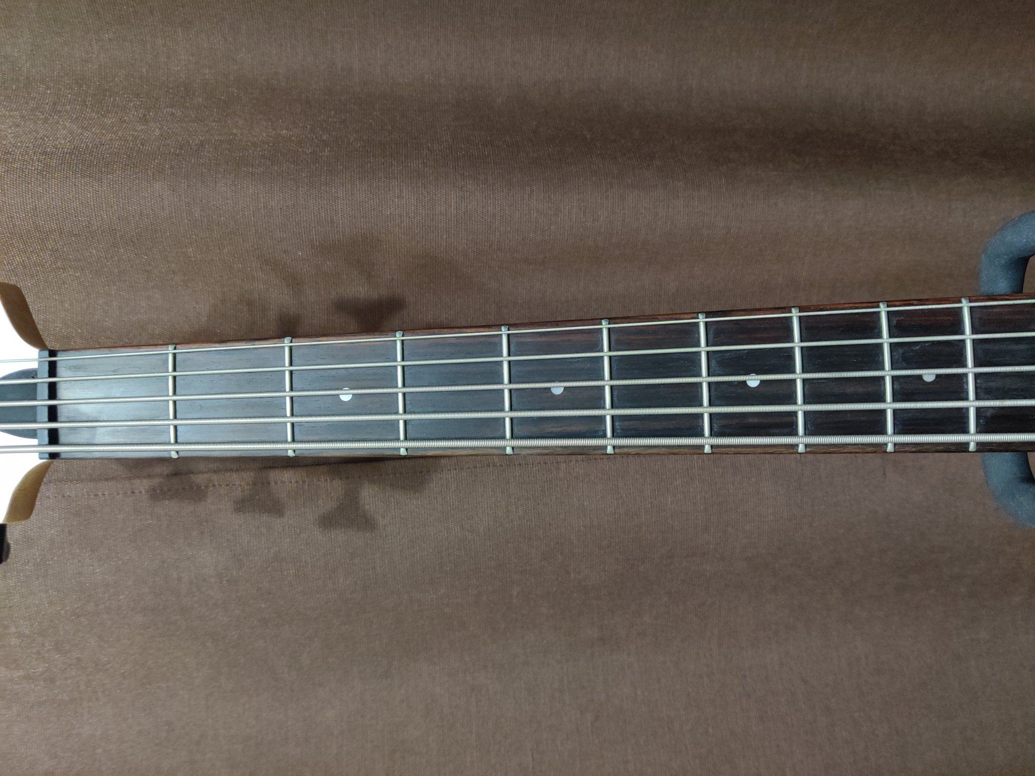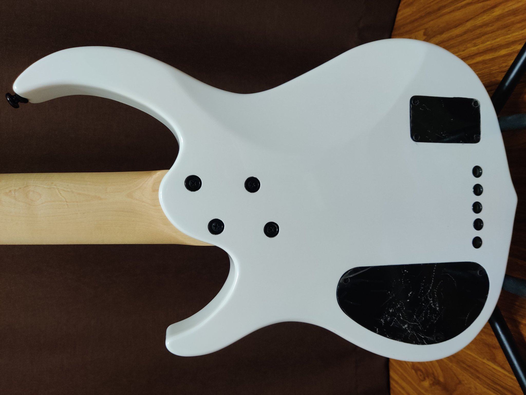 В итоге, бас использовался на 7-ми концертах (это видно по струнам, т.к. при нормальном использовании, в местах соприкосновения струн и ладов, на струнах видны следы) и с августа месяца лежит у меня дома без дела. Можно сказать, что инструмент практически новый, однозначно не разыгранный. Состояние, понятное дело, отличное, только однажды басист не вписался в дверной проем и слегка зацепил углом головки грифа дверной косяк, отколов кусочек лака (на фото видно). Никакого повреждения дерева нет, откололся именно лак, поэтому, с учетом того, что это просто белый лак, легко можно закрыть, капнув одну каплю и всё. Есть парочка малюсеньких вмятин лака на боках инструмента, они были с момента покупки, видны под определённым углом. Задние крышки в плёнках , никаких царапин на них нет (сами пленки, да, слегка подрались). Вся электроника и механика работают без проблем. Гитара в родной коробке, никакого чехла или кейса для нее не приобреталось.