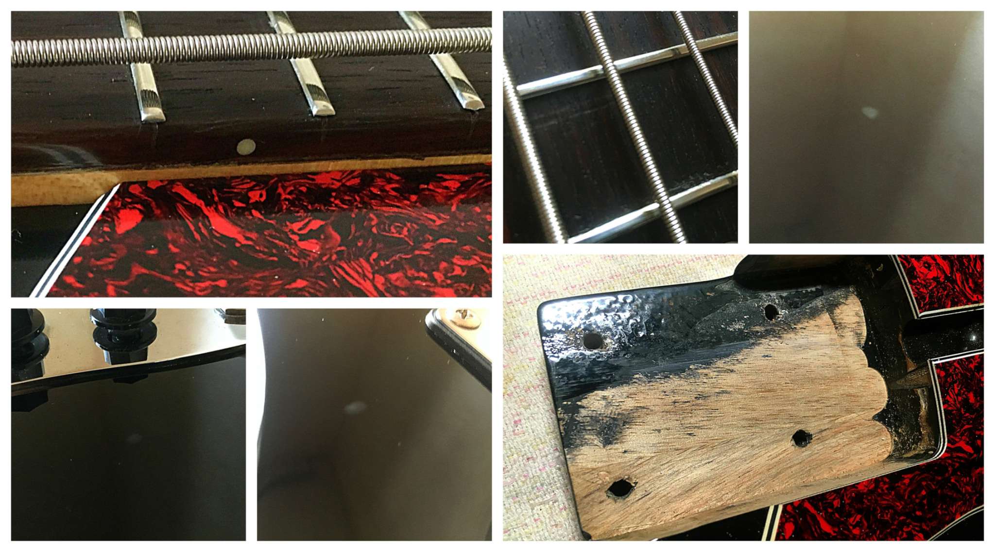 Состояние экземпляра отличное: видимые повреждения и потертости отсутствуют, все комплектующие оригинальные. На ЛКП проявляются небольшие просветления (см. фото), практически незаметные глазу. Единственный огрех - следы предположительного ремонта накладки в районе последних ладов (склейка), либо издержки сборки. Проблем с играбельностью нет - инструмент с легкостью отстроен под 1,8...2,0мм над 12м ладом на новых струнах D'Retardio