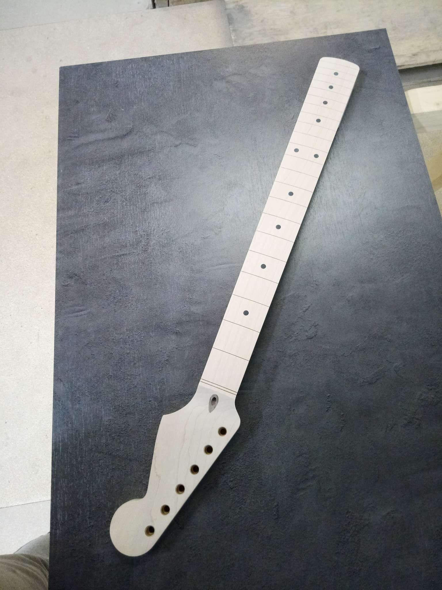 Целый кленовый гриф, без накладки. 22 слота для ладов, радиус накладки 12 дюймов. Толщина у первого лада 19мм, у двенадцатого 21 мм. Маркеры - черные точки. Вставки анкерного канала и гайки - орех. Анкер, само собой, работает (в обе стороны). Сверловка под винтажные колки (при необходимости пересверливаем под современную механику). Ширина у порога 42мм, у пятки 56мм. Состояние - новый. Без лака.