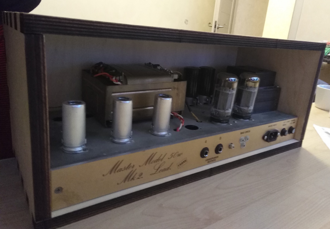 В преде стоят ECC83, выходные - 6П3С-Е. Подвал виден - емксти WIMA, EPCOS. Корпус не склеен, для фото сложил - сделан из 15мм фанеры, ласточкин хвост соединение, ручку для переноски приложу.