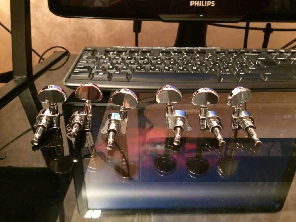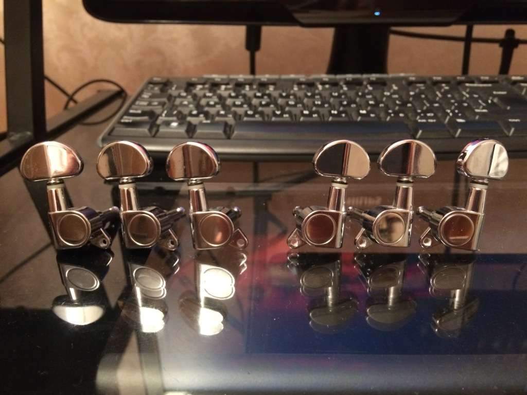 Очень качественные китайско-корейские колки. Снял со своего полуакустического Ibanez AG-75 (по серийнику сделан в Корее). Штоки без какого-либо люфта, строй держали без нареканий. Цвет - хром, ушко под крепление под 45 градусов. Саморез в комплекте - ставь и играй. Заменил при смене струн только лишь потому что в моём гитарном шкафу завалялся старый комплект колков Gotoh.