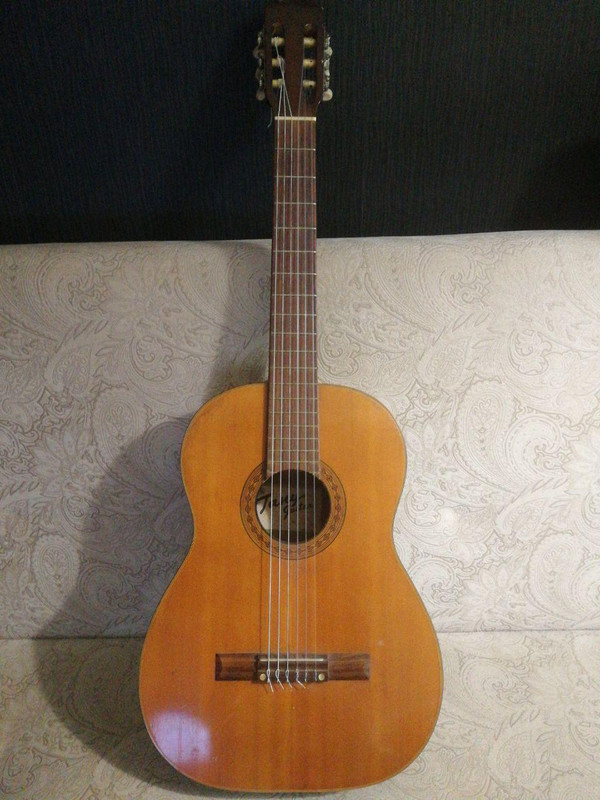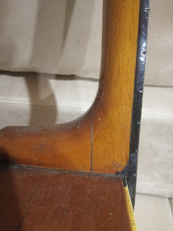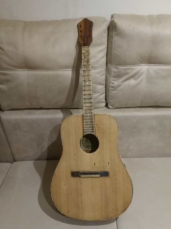 акустика кремона. ей очень грустно.Снят лак с передней деки, кант потрескался и частично отвалился, нет порожка, колков, накладку или шлифануть или в топку.