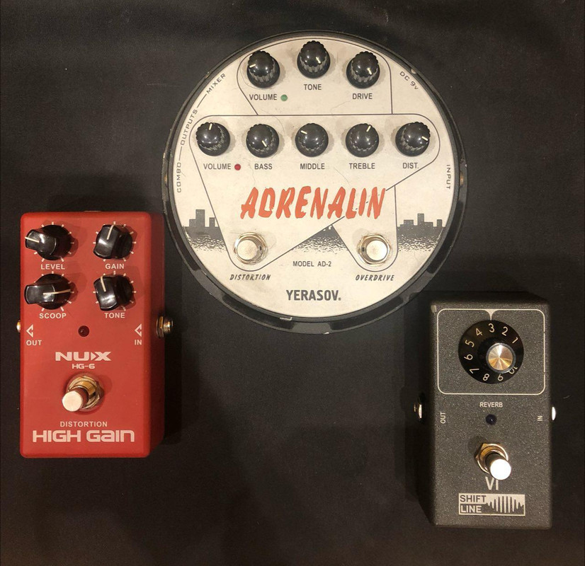В продаже педали, изображенные на фото. 1 кетайский митолзон NUX HG-6, 1 пензенский овердрайв\дестракшн AD-2 и 1 вполне хороший ревер Shift Line без лишних свистелок и перделок.