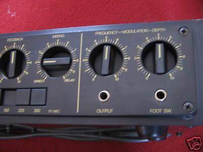 Прибор 82 года, состояние хорошее. Имеет 2 входа разной чувствительности (инструмент/линия), регулируемый входной уровень гейна, 2-х полосный эквалайзер, 5 диапазонов дилея от 10 до 300мс с регулируемым временем задержки, регулируемое количество повторов (feedback), микс чистого и обработанного сигналов, а также встроенную модуляцию - регулируется глубина и скорость. Выходы раздельные, для прямого и обработанного сигнала, как на большинстве приборов такого типа. Есть гнездо для футсвитча (в комплект не входит). Построен на классических микросхемах BBD Panasonic MN3205, имеется возможность вручную подстраивать время дилея внутри прибора на каждом из пресетов. Звук - как и положено хорошему аналоговому дилею, теплота и объем.