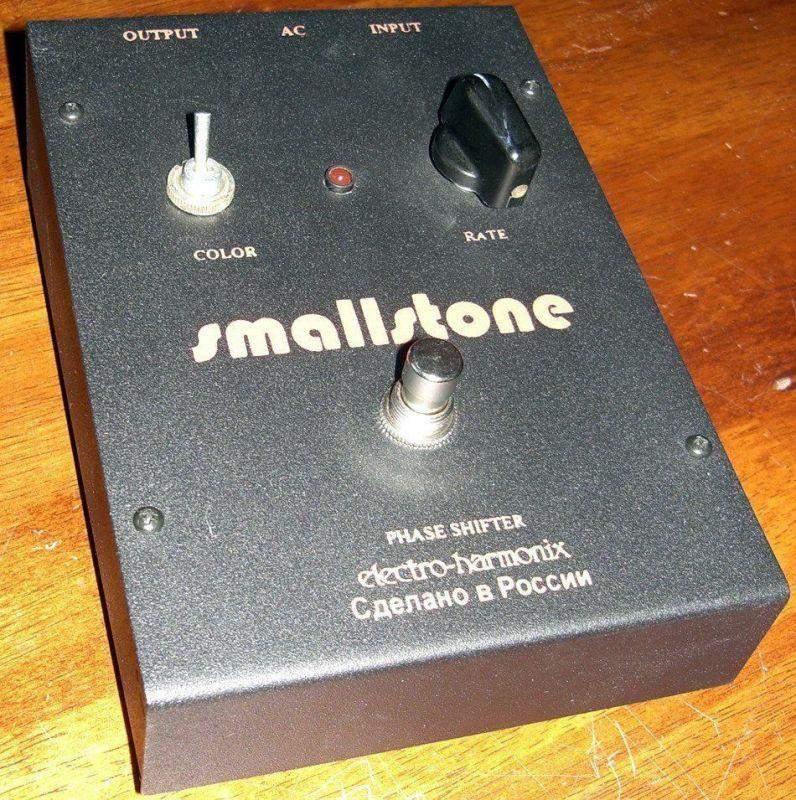 SMALL STONE - второй по популярности эффект Electro-Harmonix. Хорошо звучит с чистой и с "примоченной" гитарой, придавая звуку психоделическую полётность. Русский вариант отличает более тёмное звучание и больший диапазон экстремальных настроек регулятора Rate. И по звуку, и по схематике SMALL STONE отличается от других фэйзеров и имеет лишь один аналог - MAESTRO STAGE PHASER, в котором был использован тот же принцип разницы двух входных напряжений для получения фазового сдвига.