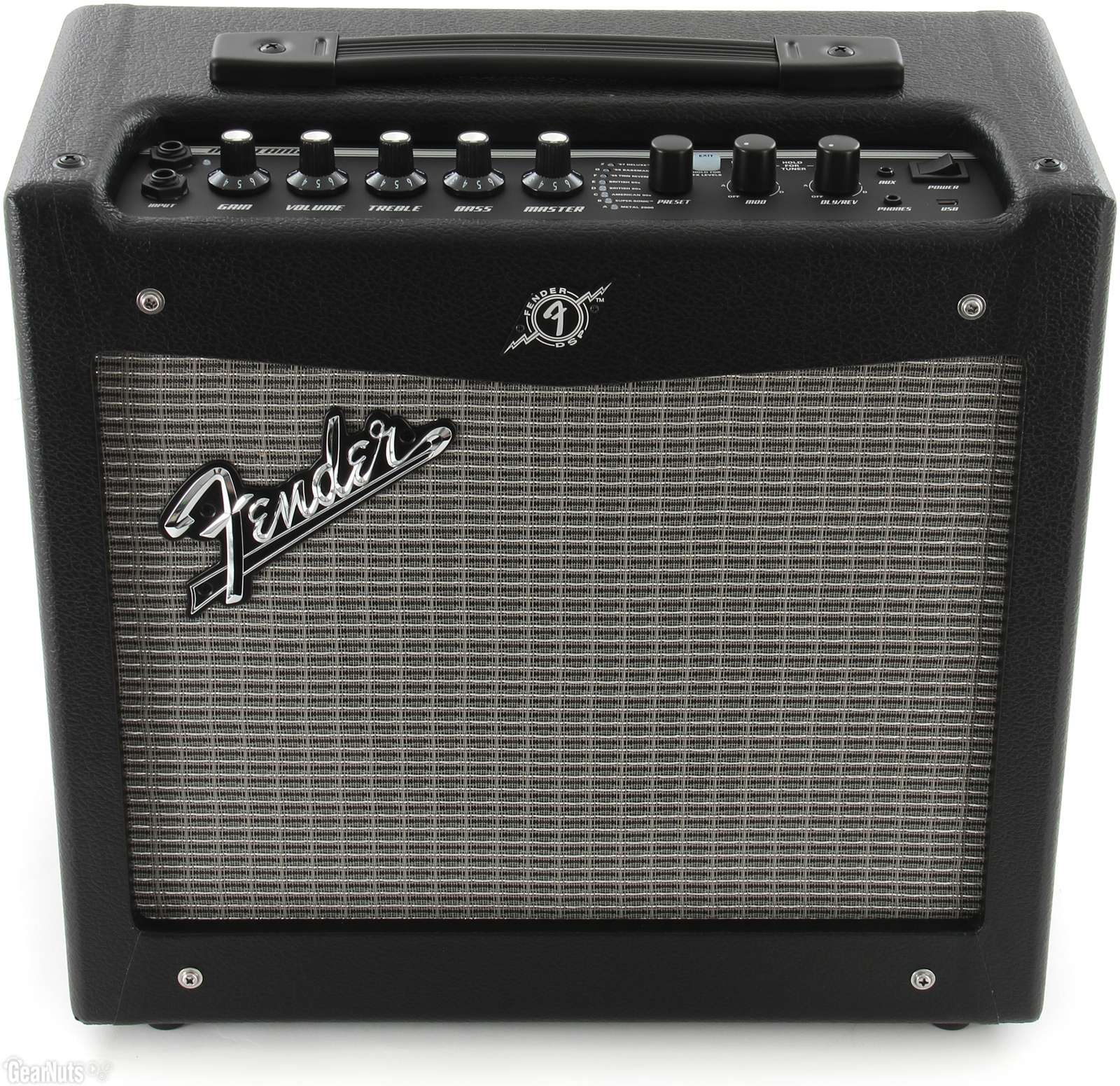 Регуляторы: Gain, Volume, Treble, Bass, Master, Preset Select, Modulation Select, Delay/Reverb, кнопки сохранения, выхода и темпа