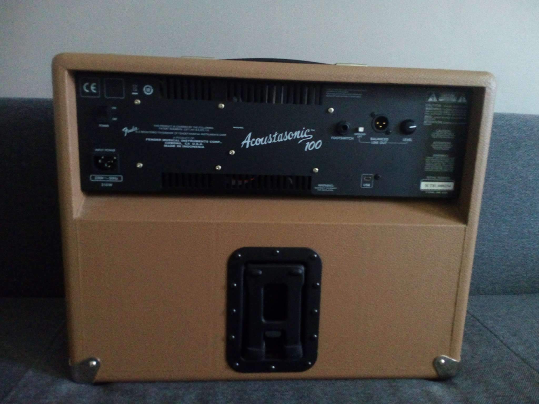FENDER ACOUSTASONIC 100, комбо усилитель для гитары (как электро, так и полуакустической), 100 Вт, 2 канала (2 независимых входа - инструментальный и интсрументальный/микрофонный) с фантомным питанием, 9 встроенных эффектов (Vibratone, Chorus, Reverb+Chorus, Chorus+Delay, Delay, Reverb+Delay, Plate, Room, Hall), моделирование электрогитарных усилителей, балансный линейный выход с уровнем громкости, 1х8' динамик + высокачастотный твитер, габариты (ШхВхГ) 50х39х25 см, вес 8,2 кг.Выход прямо к компьютеру через micro usb. В комплектацию входит провод питания.