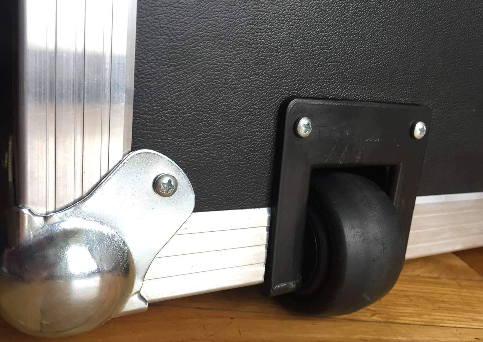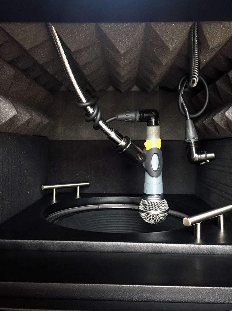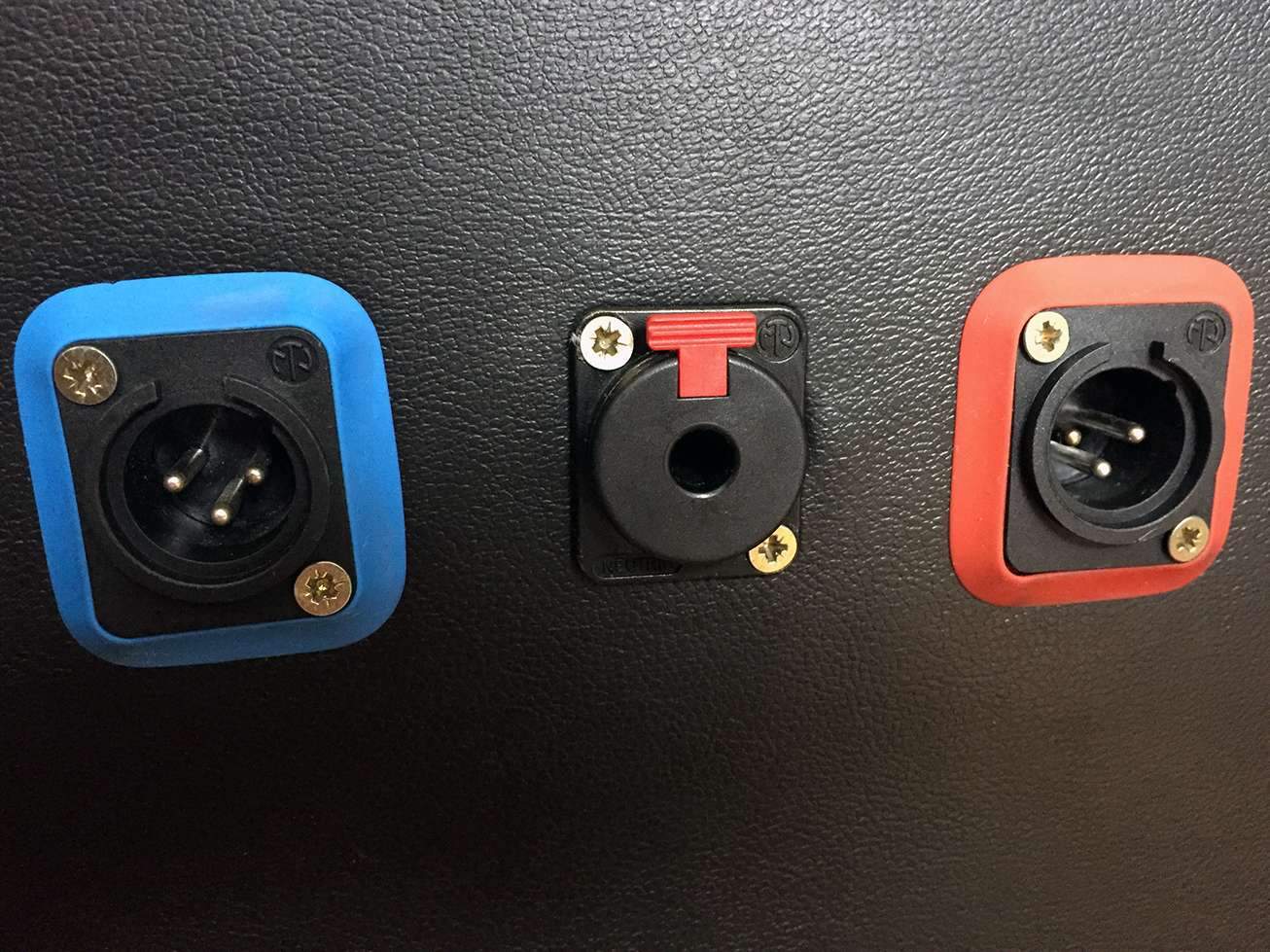 Качественная фурнитура, разъемы Neutrik. Кабинет на резиновых колесах, имеет 2 выхода с микрофона, 2 держателя микрофона, закрепленные на базы, а потом в корпус, вход для усилителя. База динамика изолирована от стенок кабинета, под слоем пирамиды лежит дополнительный материал. Общая толщина до верха пирамиды 17см сверху, 13см сбоку.