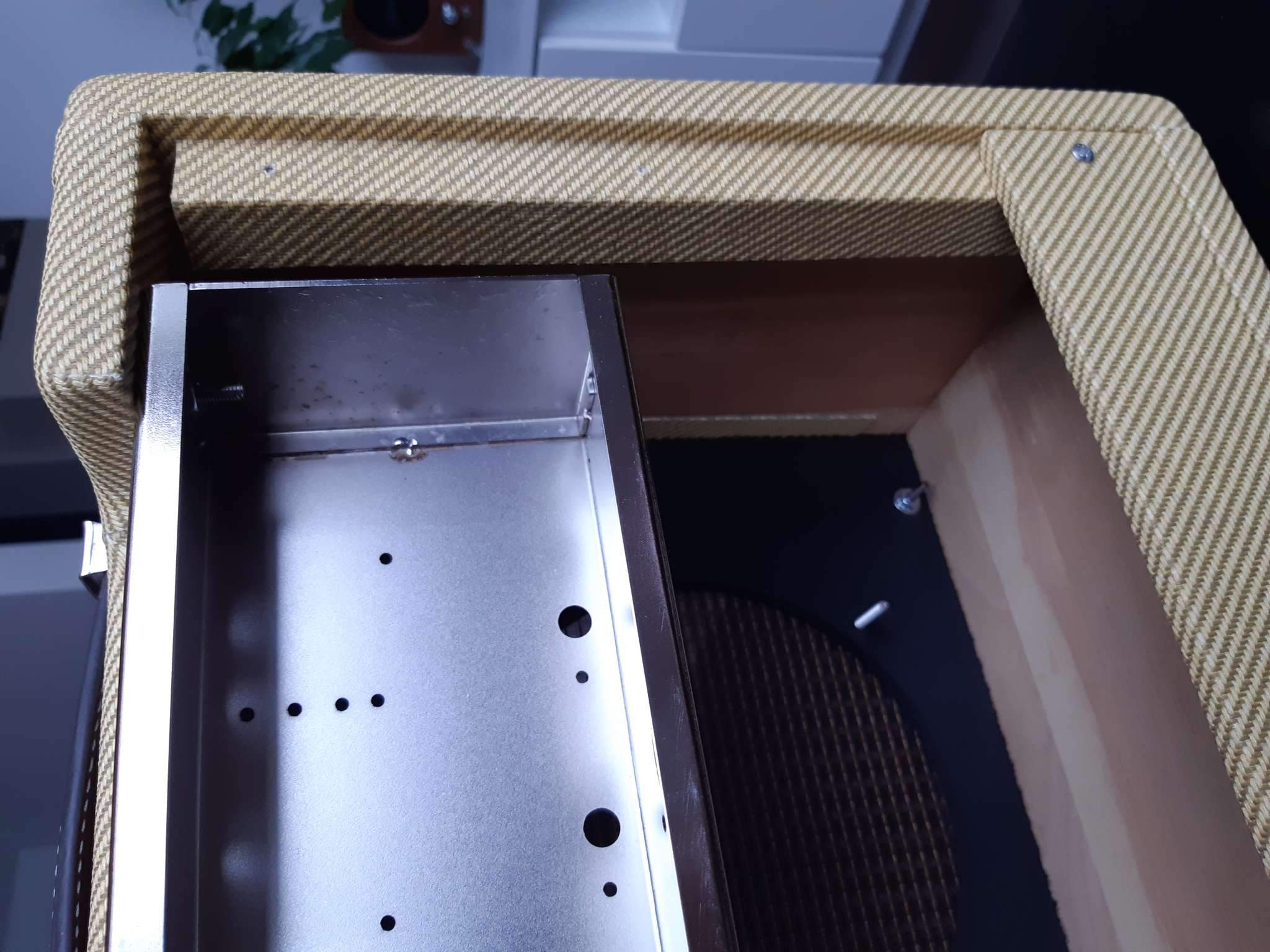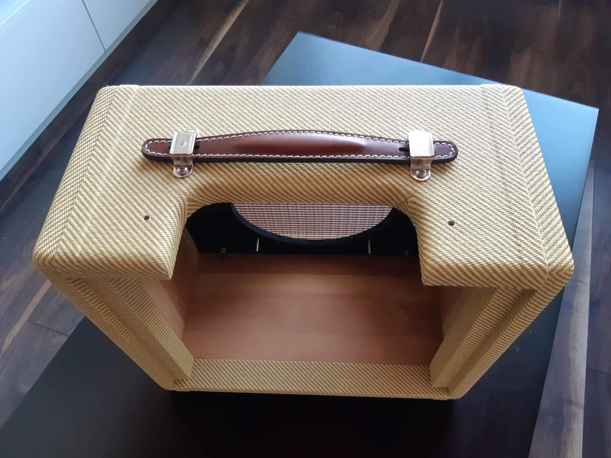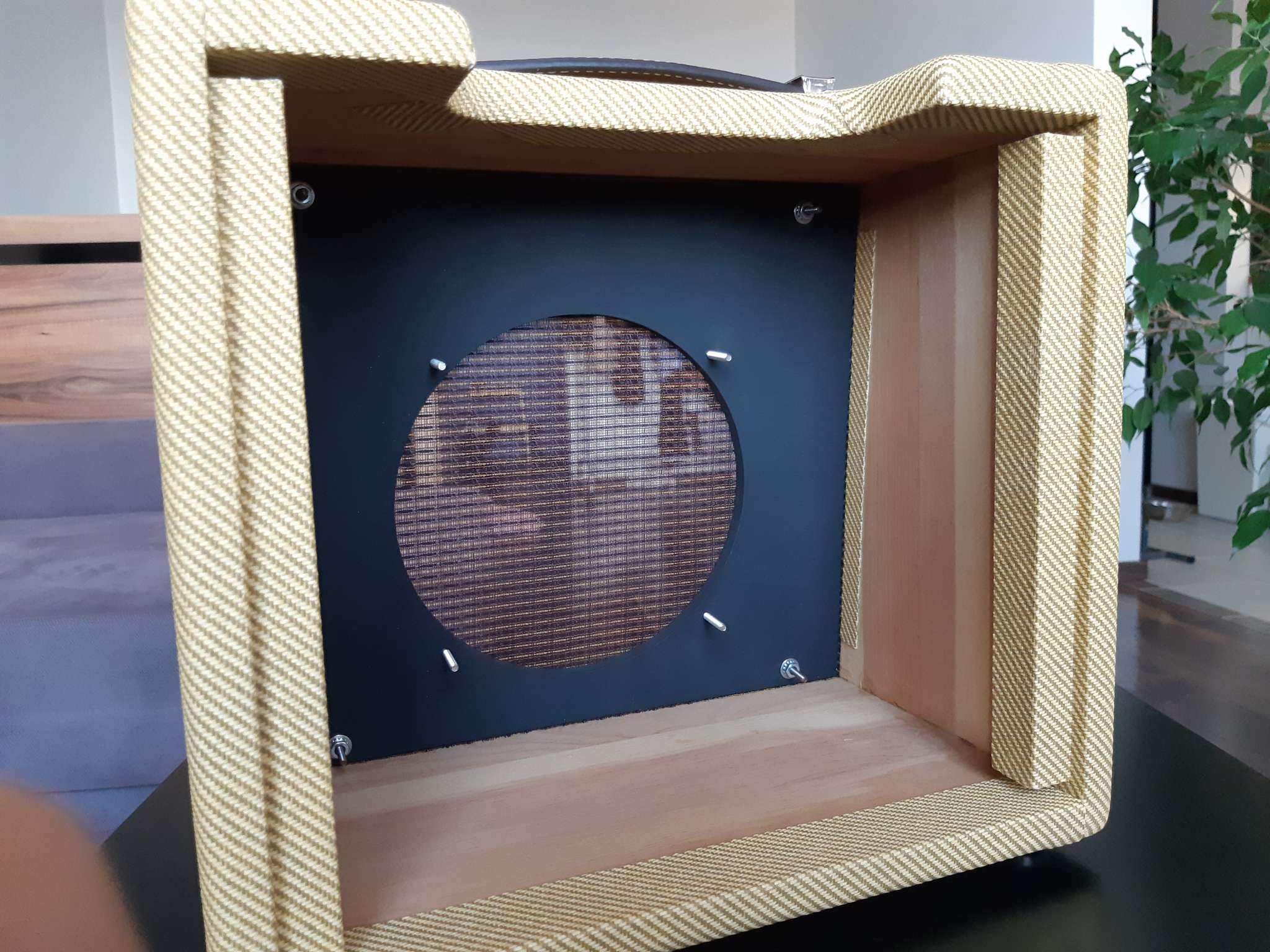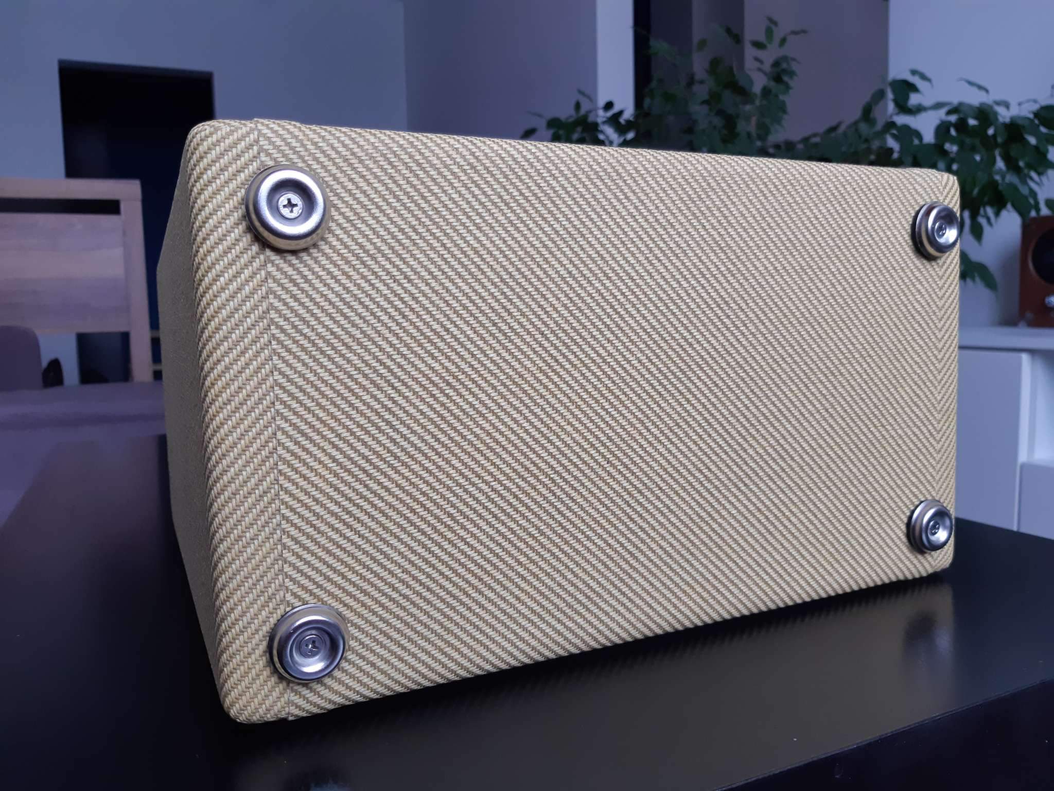 Материал корпуса 18мм массив сосны, стенки 6мм фанера, покрыт натуральным твидом.