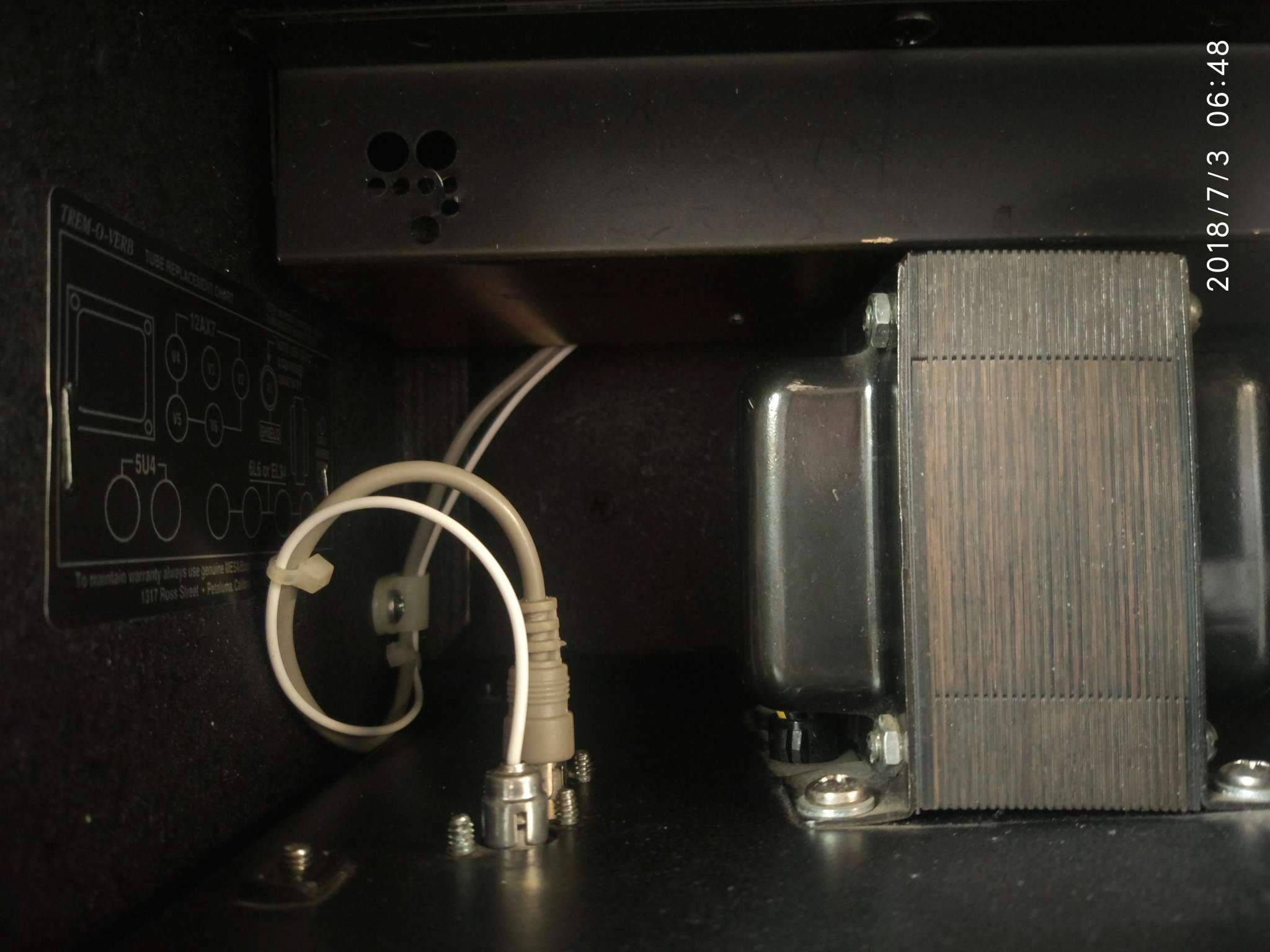 Несколько эпитетов о усилителе и его звуке: tremoverb это всем знакомый ласкающий слух звук старого доброго двухканального дуал ректифаера в комплекте со встроенной пружинной реверберацией, тремоло и очень вкусным клин каналом. Очень разносторонне звучащий аппарат. Это ранняя версия со впаянным сетевым шнуром. Звук двухканальных ректифаеров по мнению большинства значительно выигрывает у более поздних трехканальных версий.