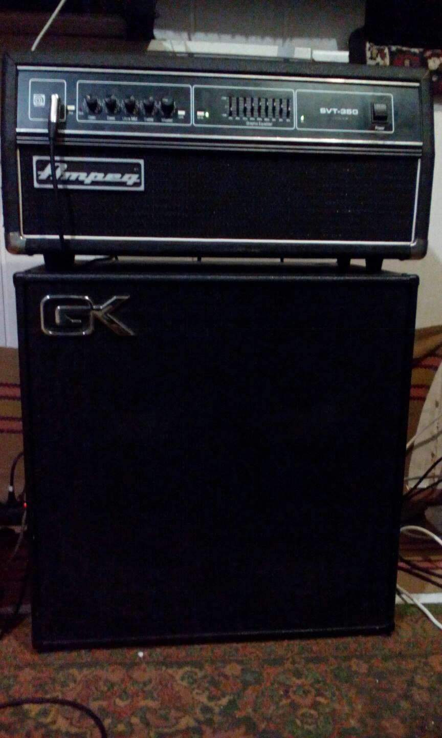 Ampeg SVT-350 (USA) на полевиках Усилитель серии "Classic". Его мощность - 200 Вт при сопротивлении 8 Ом, 350 Вт - при сопротивлении 4 Ома. Есть регулировки тембров и девятиполосный графический эквалайзер. Возможно ослабление уровня сигнала на 20 дБ. Встроенный лимитер (ограничитель) позволяет использовать усилитель на полную мощность, а индикатор, расположенный на передней панели усилителя, отображает пики сигнала. Кабинет Gallien Krueger MBE 4x10" 800W 8 Ohms.