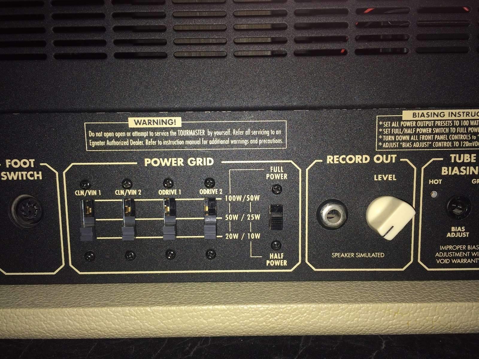 Power Grid: Очень удобная фишка, которые вы не найдете нигде более, кроме усилителя Egnater Tourmaster. Используя 4 ползунка на задней панели аппарата вы можете настраивать выходную мощность каждого канала в отдельности! Кроме этого имеется один общий трехпозиционный переключатель FULL POWER/ HALF POWER. В режиме FULL POWER вы можете выбирать между 100Вт, 50Вт или 25Вт на каждый канал. А в режиме HALF POWER - 50Вт, 25Вт и 10Вт.