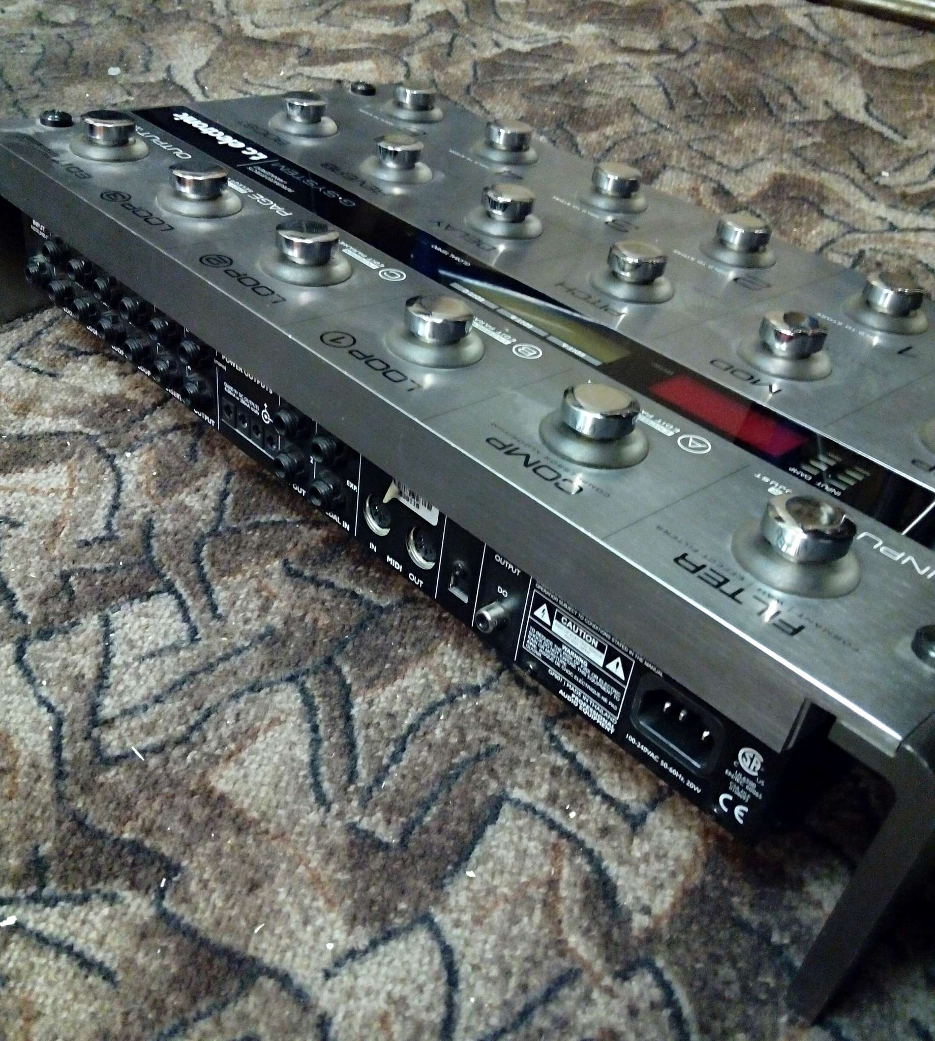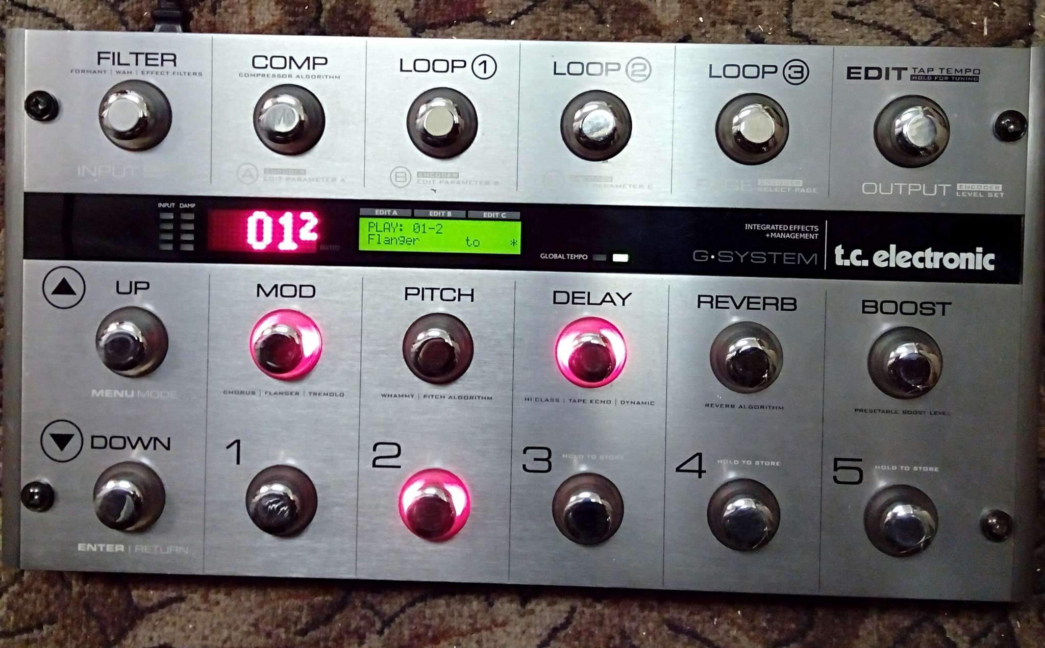 TC Electronic G-System состоит из напольного контроллера и модуля GFX 01, 25 различных типов эффектов (до 9 одновременно), 4 петли для подключения педалей эффектов, 1 петля для внешнего предусилителя, 4 x 9 В выхода для питания эффект-педалей, USB порт для обновления ПО, возможность установки DSP модуля в 19` рэковую стойку, MIDI IN/OUT для управления внешними MIDI-совсместимыми устройствами, 2 разъёма для подключения педалей экспрессии. 4 реле на 2-х 1/4` разъёмах для переключения каналов усилителя/преампа.
