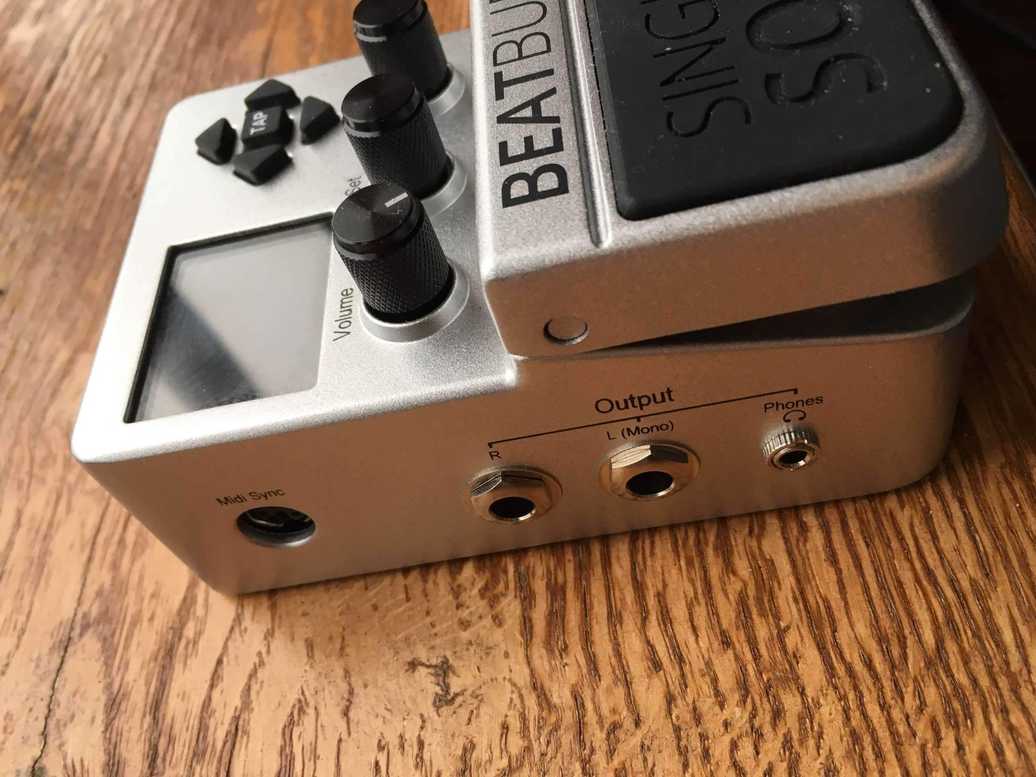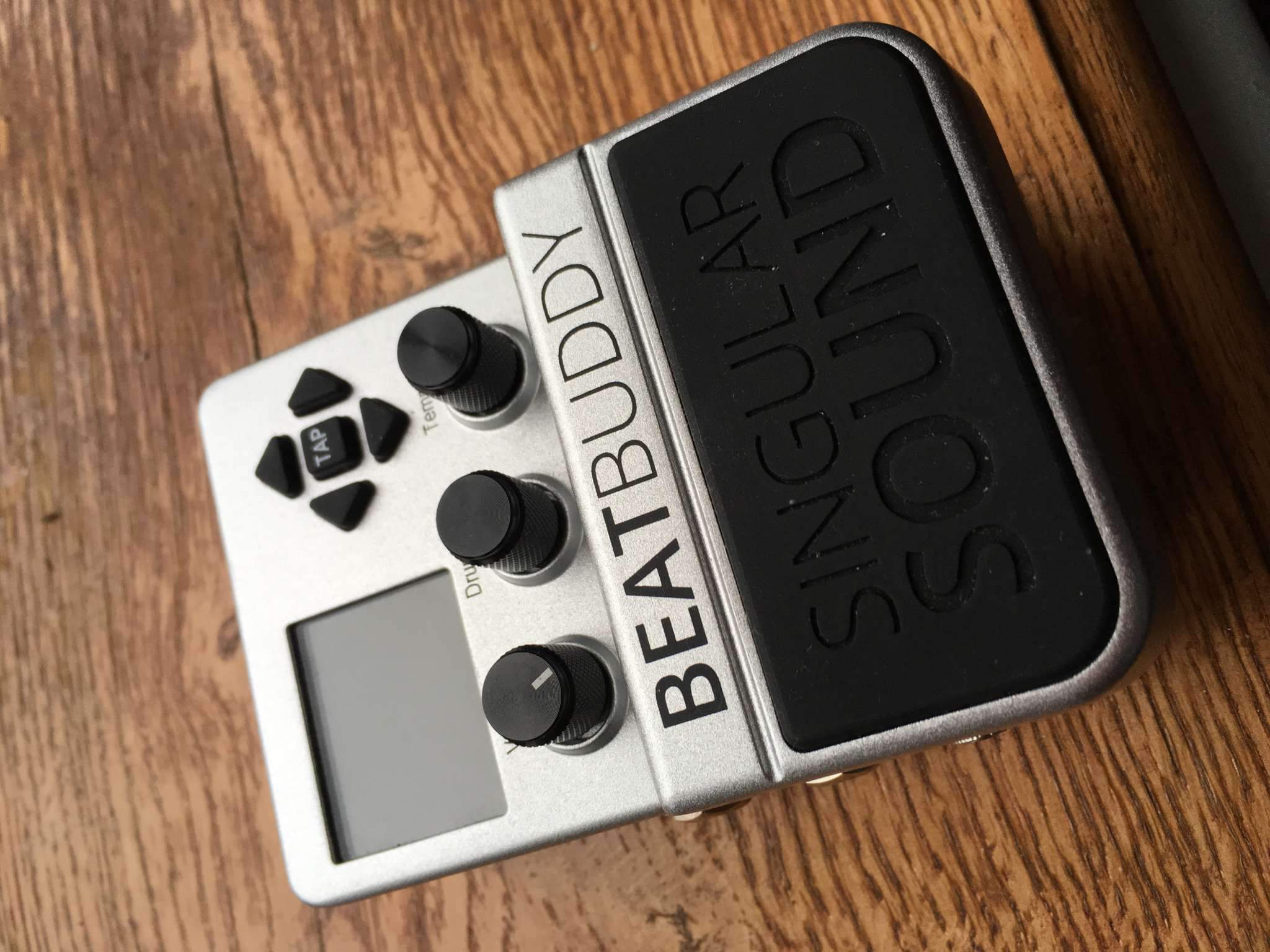 У BeatBuddy очень информативный дисплей, на котором виден отсчет по долям такта (двигающийся квадратик), а также текущая часть «песни». Так, если квадратик синий, это значит, что бит остановлен, если красный – исполняется интро, если зеленый – исполняется основная часть песни, желтый – исполняется сбивка и так далее.