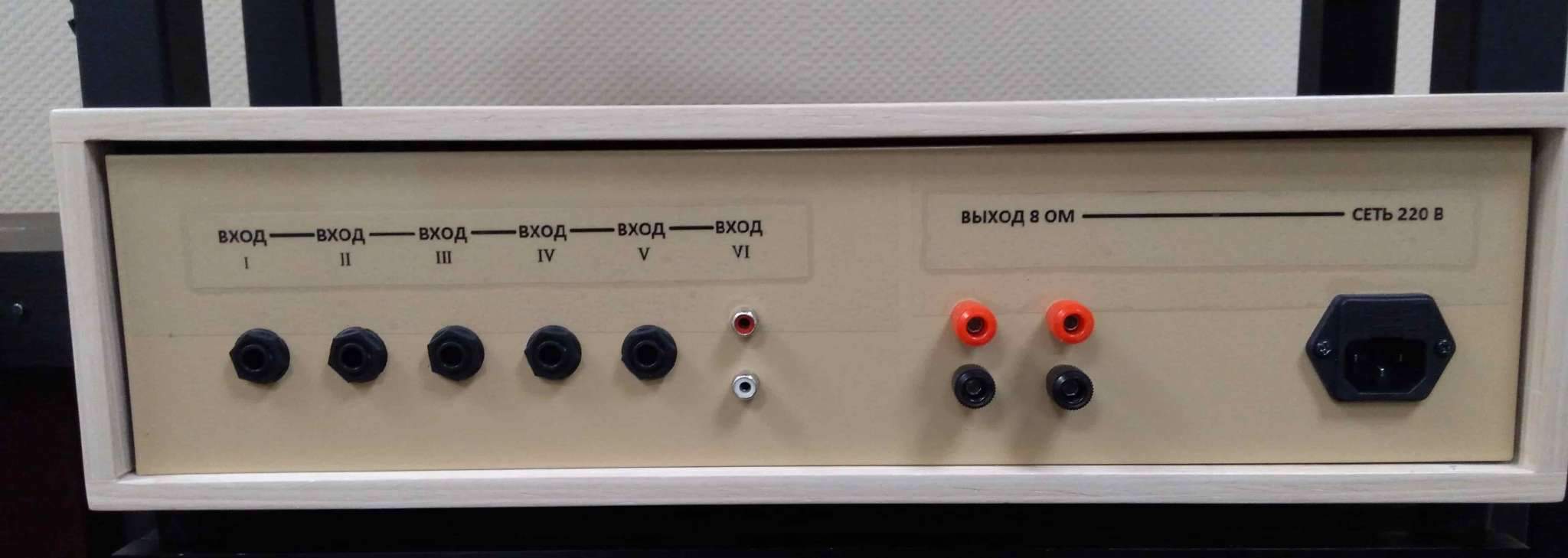 Корпус усилителя изготовлен на заказ (фанера 6 мм оклеенная шпоном) Лицевая панель заменена, установлены качественные регуляторы с тактильным эффектом "трещётка", задняя панель полностью модернизирована (разъемы 5-DIN заменены на моноджеки 6,3 мм), также прямой вход на оконечный усилитель выполнен в виде двух тюльпанов (RCA).