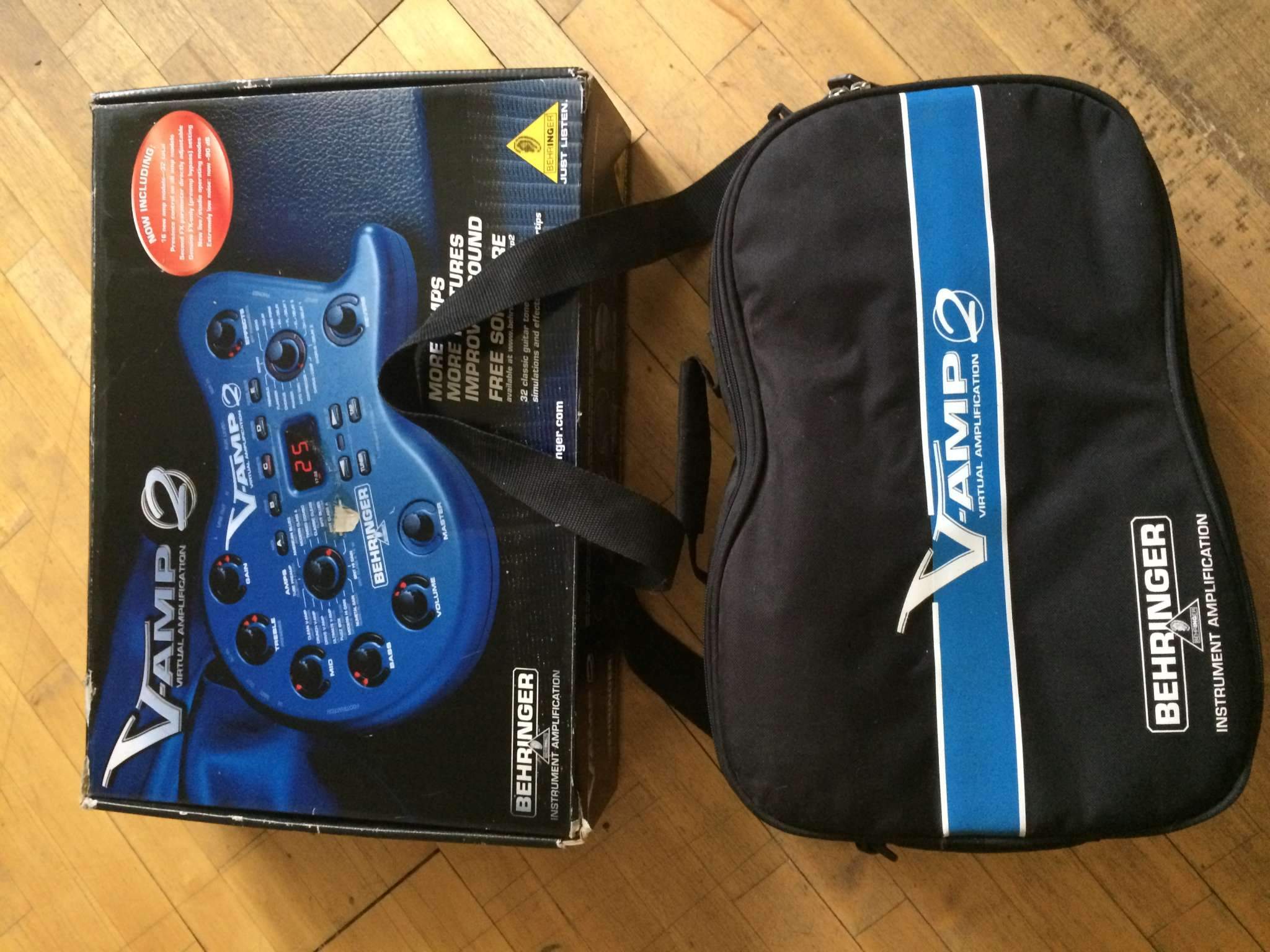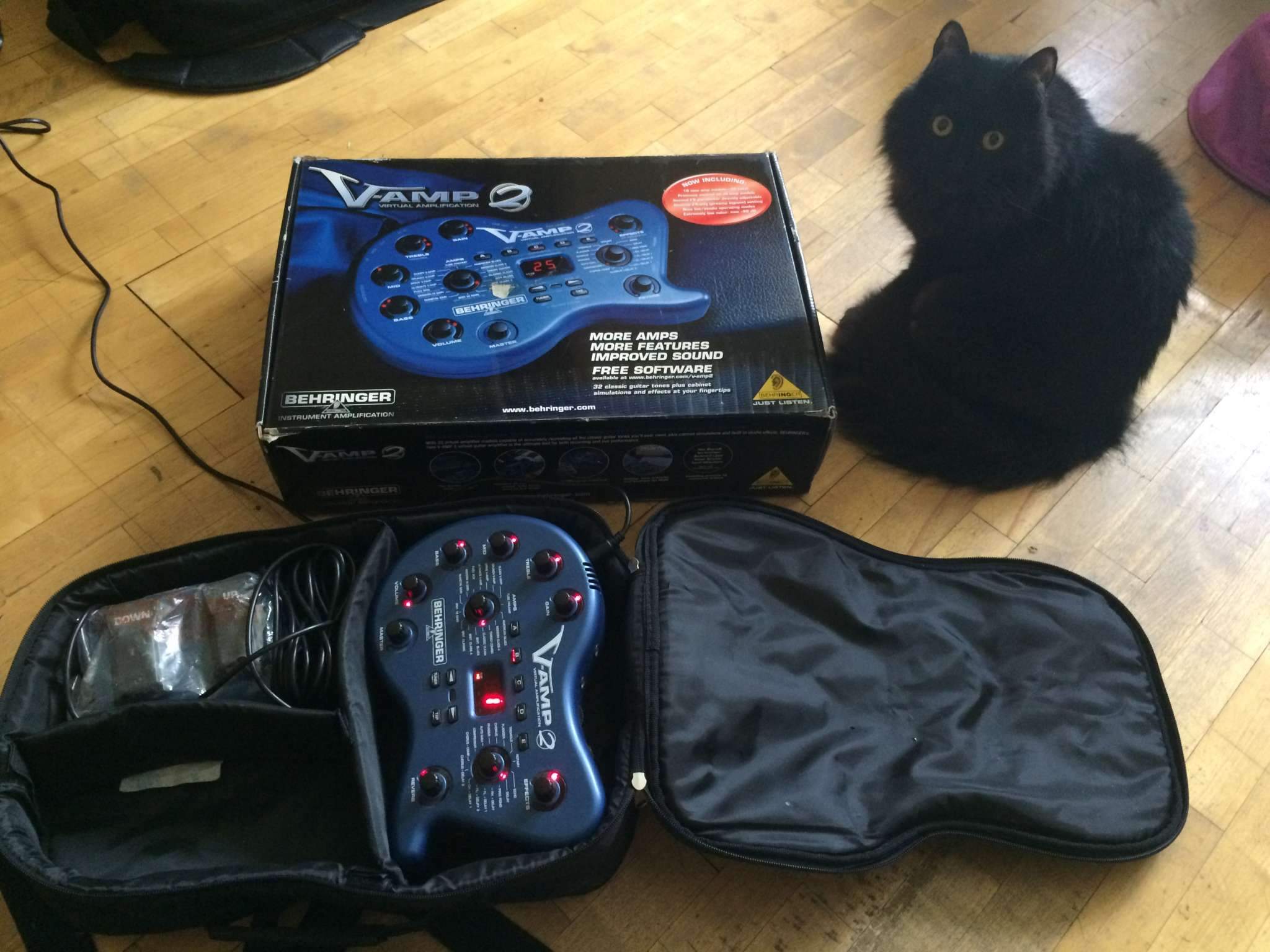 В комплект поставки V-AMP 2 входят внешний блок питания, 2-кнопочный ножной переключатель, а также сумка для переноски и хранения. При размерах 63 х 236 х 180 мм устройство весит 1,2 кг.