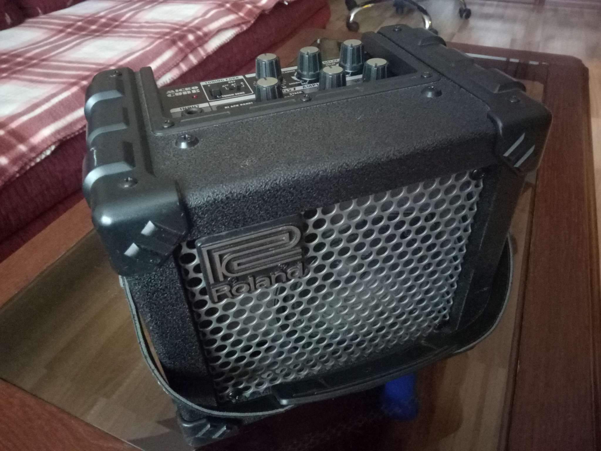 Roland Micro Cube страничка на сайте производителя. Комбик старенький, но работает нормально. Замечательно подходит для занятий дома или где-нибудь на выезде (на даче, например). Так же работает на 6ти пальчиковых батарейках.