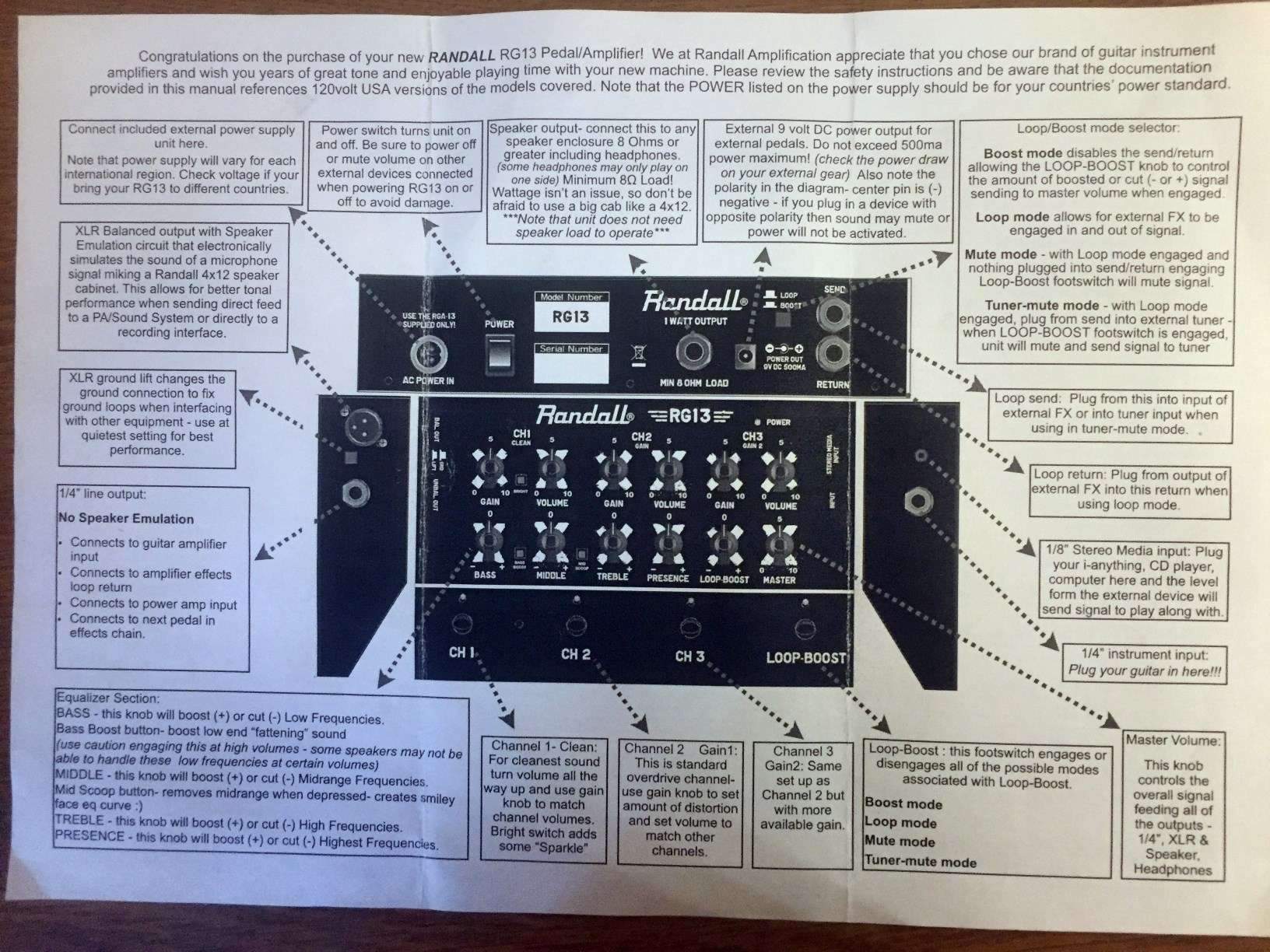 Может использоваться, как педаль, усилитель, преамп! На борту есть абсолютно всё, что может понадобиться для получения нужного результата. "Randall RG13" может работать автономным, твердотельным, трёхканальным гитарным усилителем, подключаемым прямо к гитарному кабинету и гитарному усилителю, или преампу.