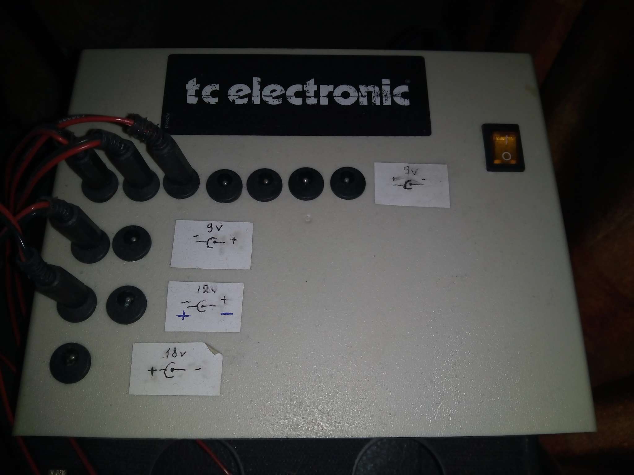 2) Блок стабилизированный, провода все в комплекте. Блок довольно объемный, поскольку содержит в себе 3 трансформатора на 9,12 и 18 вольт. Делался лично для меня, под конкретное количесво и, соответственно вольтаж педалей. Поэтому не удивляйтесь "зачем оно там надо". Когда-то было надо. Содержит 9 гнезд на 9 вольт (7 под стандартную полярность, 2 - под обратную), 2 гнезда на 12 вольт и 1 гнездо на 18 вольт (полярность стандартная +-). Оцениваю его в 4100р.