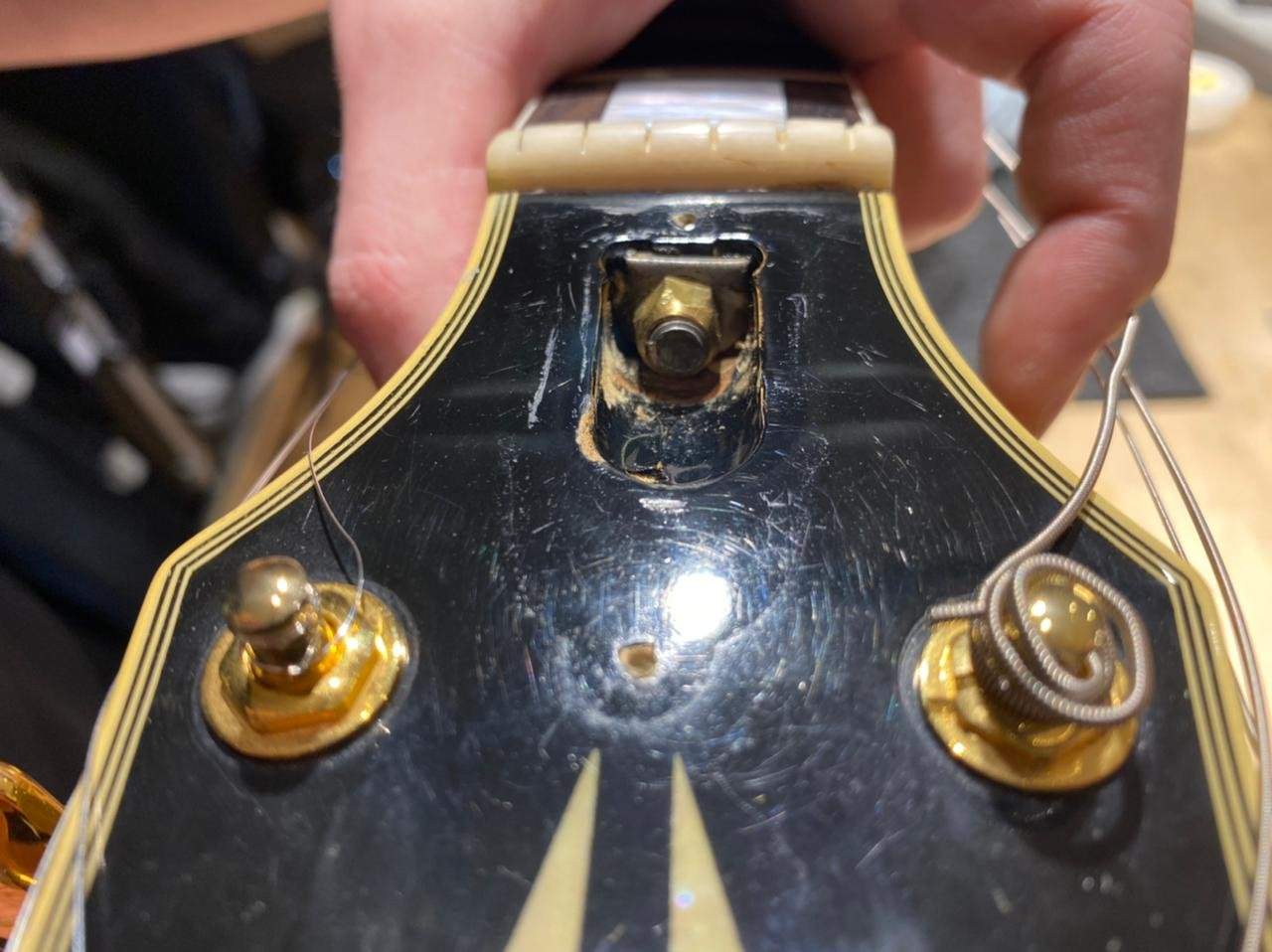 3. На голове грифа есть углубление на основании которого он сделал вывод, что ломалась голова. Чтобы точно убедиться в этом необходимо снимать краску на тыльной стороне грифа и искать там место вклейки, от чего я отказался. (фото)