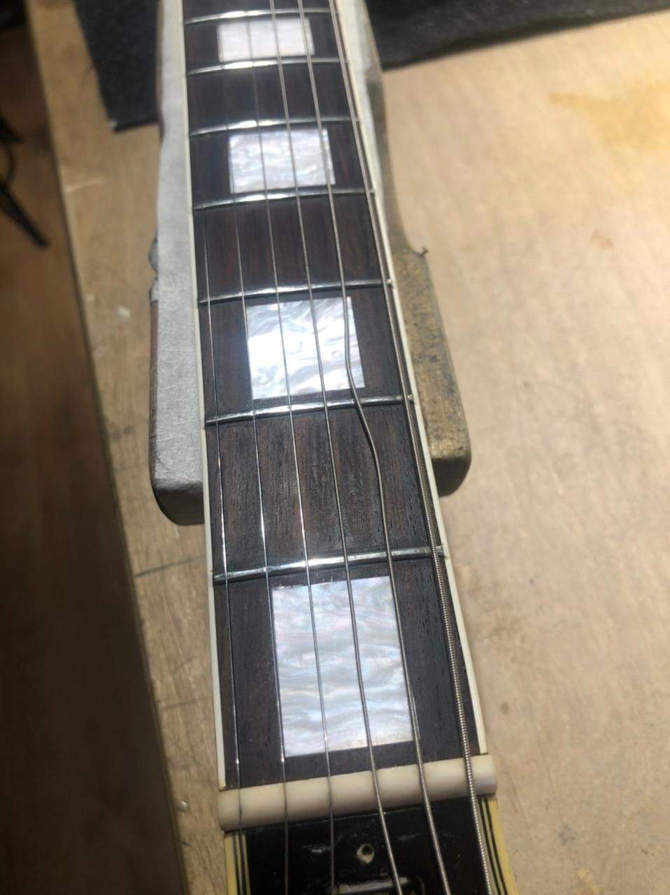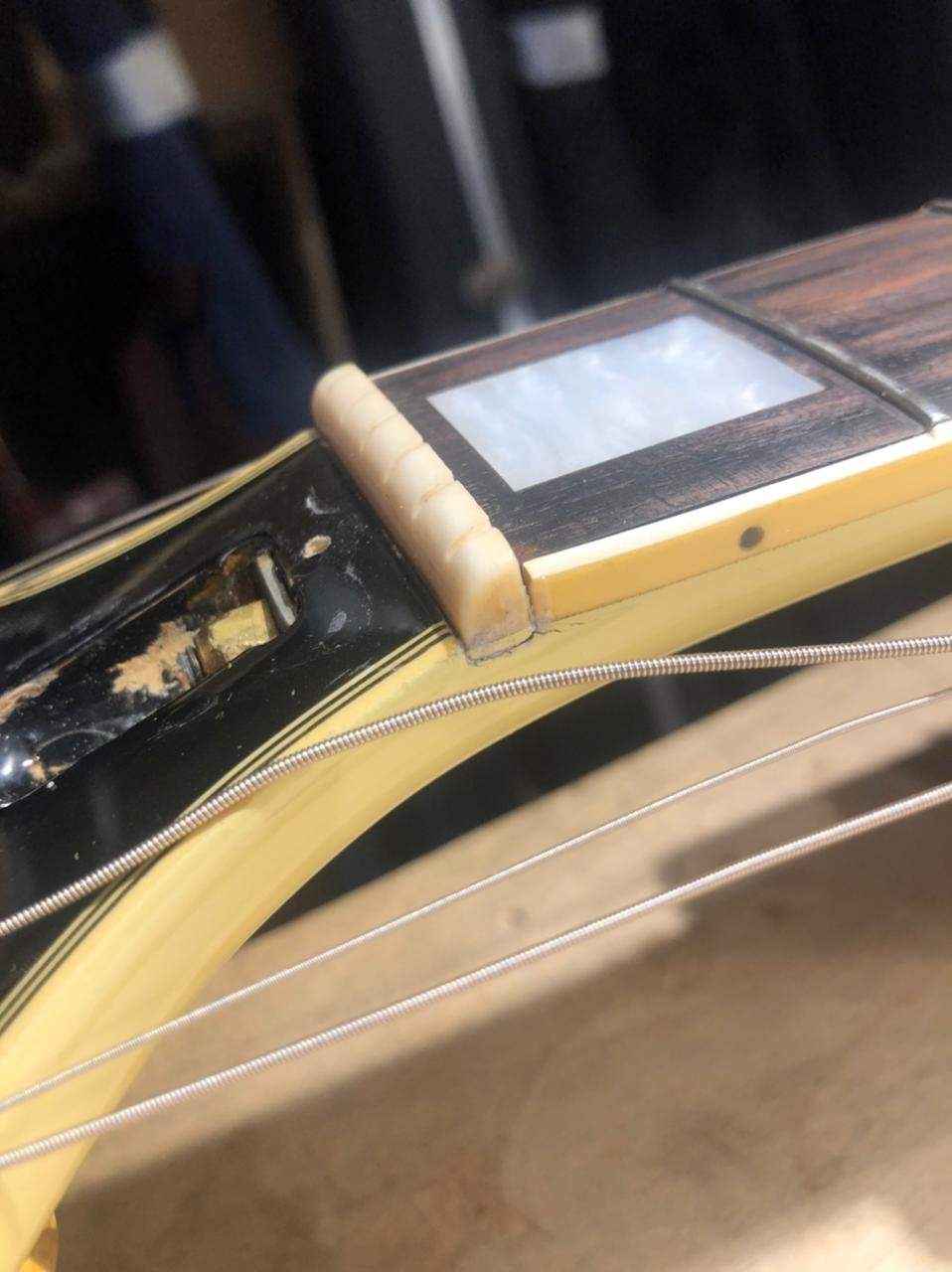 Приехав домой снял старые струны и поставил новые. После настройки обнаружил, что после 10-12 лада 6-ая струна начинает дребезжать вплоть до последнего лада. Убрать дребезжание у меня не получилось и я повез ее гитарному мастеру Алексадру Дуднику в магазин "Гитарный клуб". В ходе осмотра гитары Александром, он выяснил и показал мне следующее: