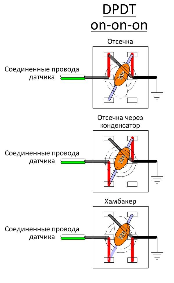 Вот такая распайка может быть с on-on-on. Все 3 режима, и конденсатор работает только когда нужен. Но с on-off-on было бы еще проще и хватило бы одного ряда контактов. Соединенные провода на средний пин, землю на один из крайних и конденсатор ногами к обоим крайним пинам.
