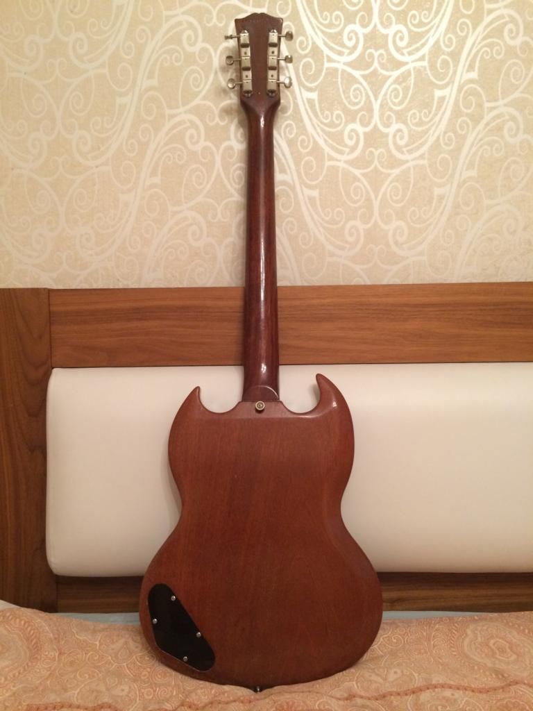 Настоящий Gibson SG Junior 1963 (не reissue) года выпуска с твердым кофром, построенная на старом заводе Гибсон в Kalamazoo, Michigan. В отличном играбельном состоянии. Гитара легкая, по весу около 2,5 кг, резонирует будь здоров, чему способствует просушенное красное дерево старого роста (old growth wood), которому к моменту создания гитары было уже около 60 лет.