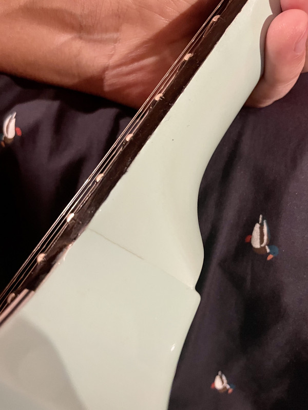 Дека из красного дерева, гриф кленовый, профиль грифа 59 или очень близок к нему. Гриф покрашен матовой нитрой. Лицевая часть головы в родной краске.