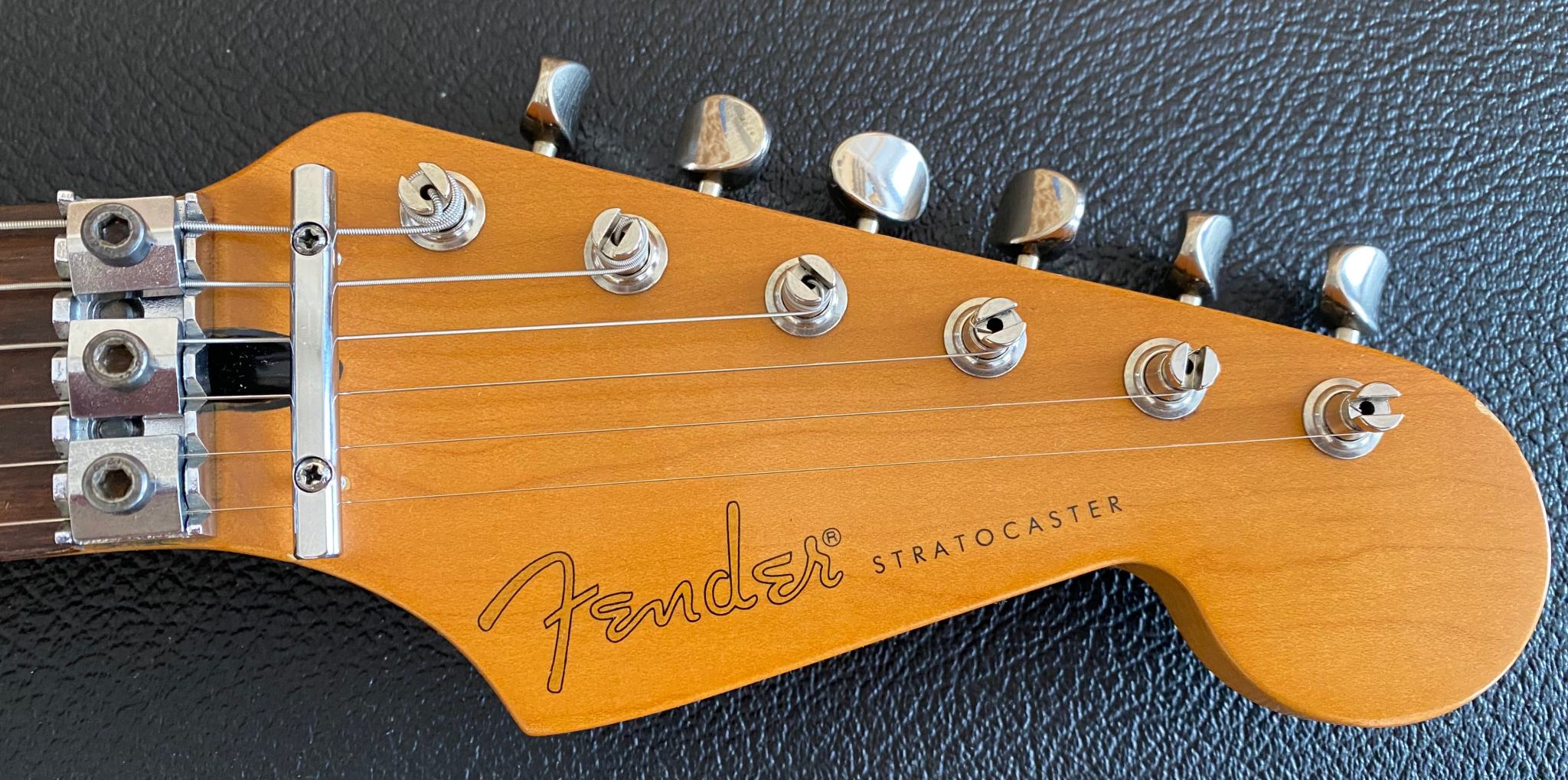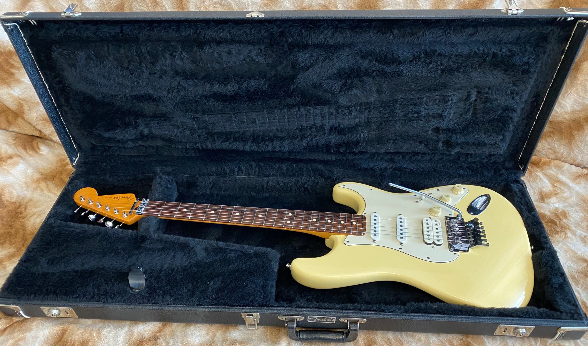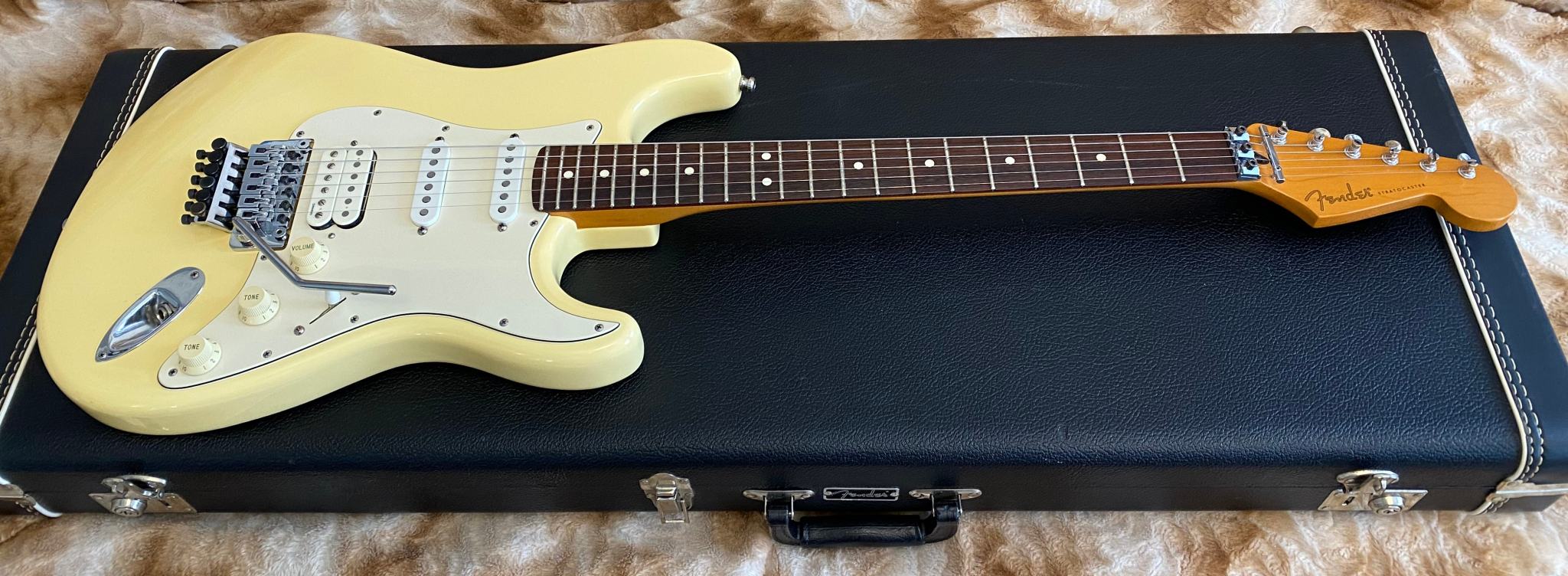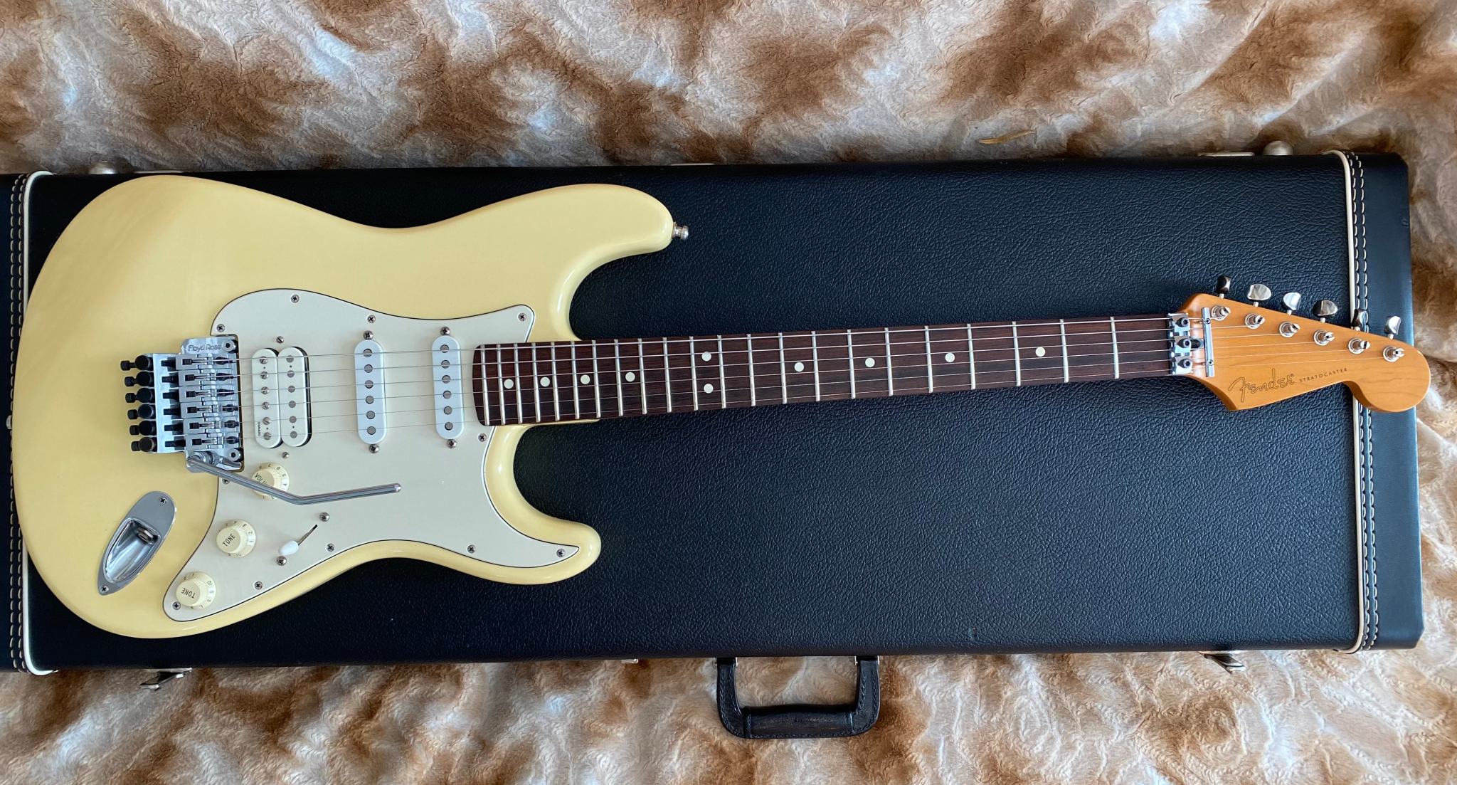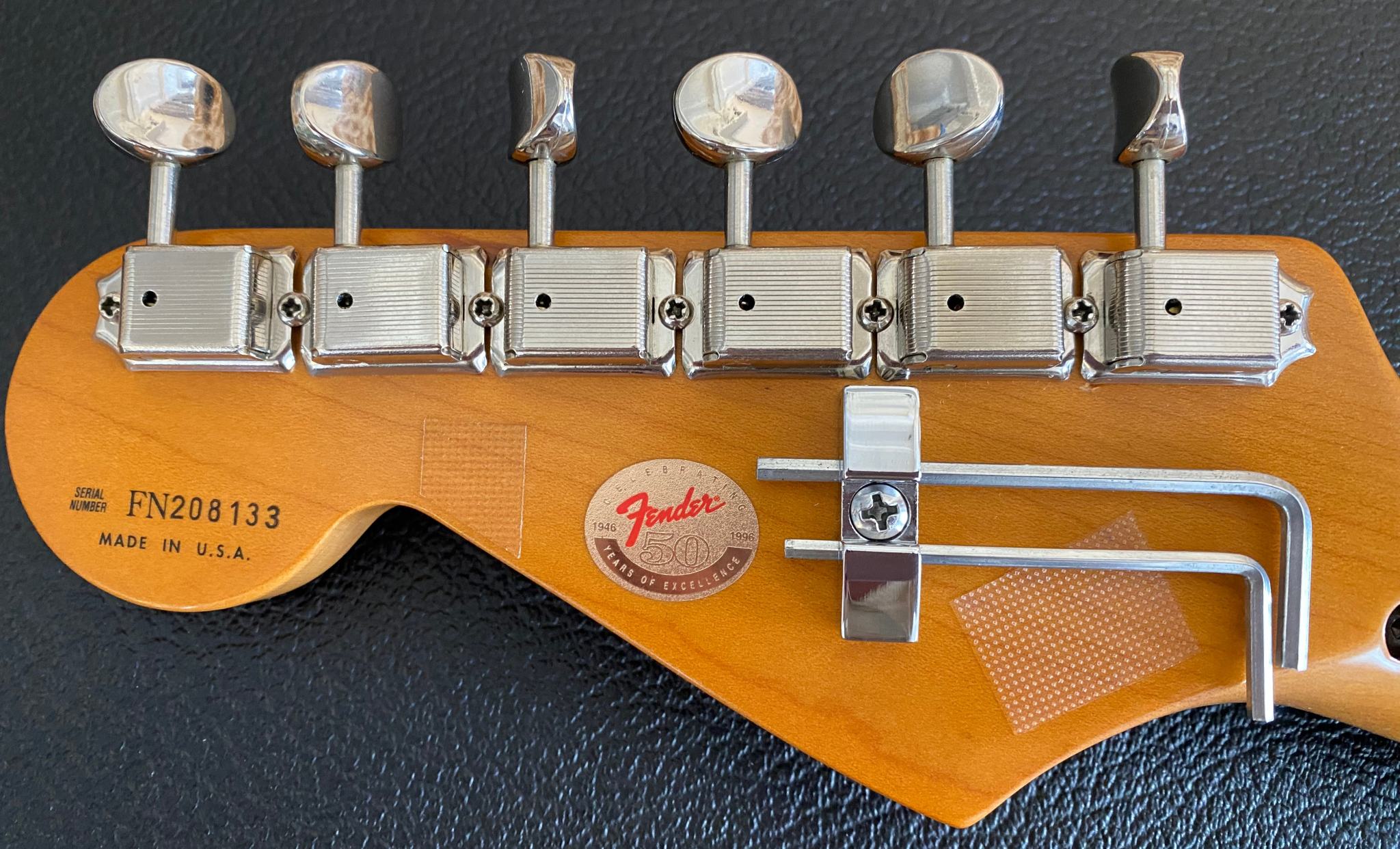 Fender Floyd Rose® Classic Stratocaster® made in USA -- Гитара сделана в Америке в марте 96-го года. В этом году Fender исполнилось 50 лет (1946-1996) и эта модель стала одной из тех, которая была выпущена специальным юбилейным тиражем. Основным отличием таких инструментов от обычных серийных является более тщательная работа по установке ладов и всего что с этим связано (в спецификациях обозначается как "Highly Detailed Fret Work"). Изюминкой гитары является установка “Original Floyd Rose” и некового звукоснимателя Хамбакер DiMarzio® Custom PAF Pro в бриджевой позиции. На данный момент в Америке данная модель уже не выпускается (производство перенесено в Мексику)