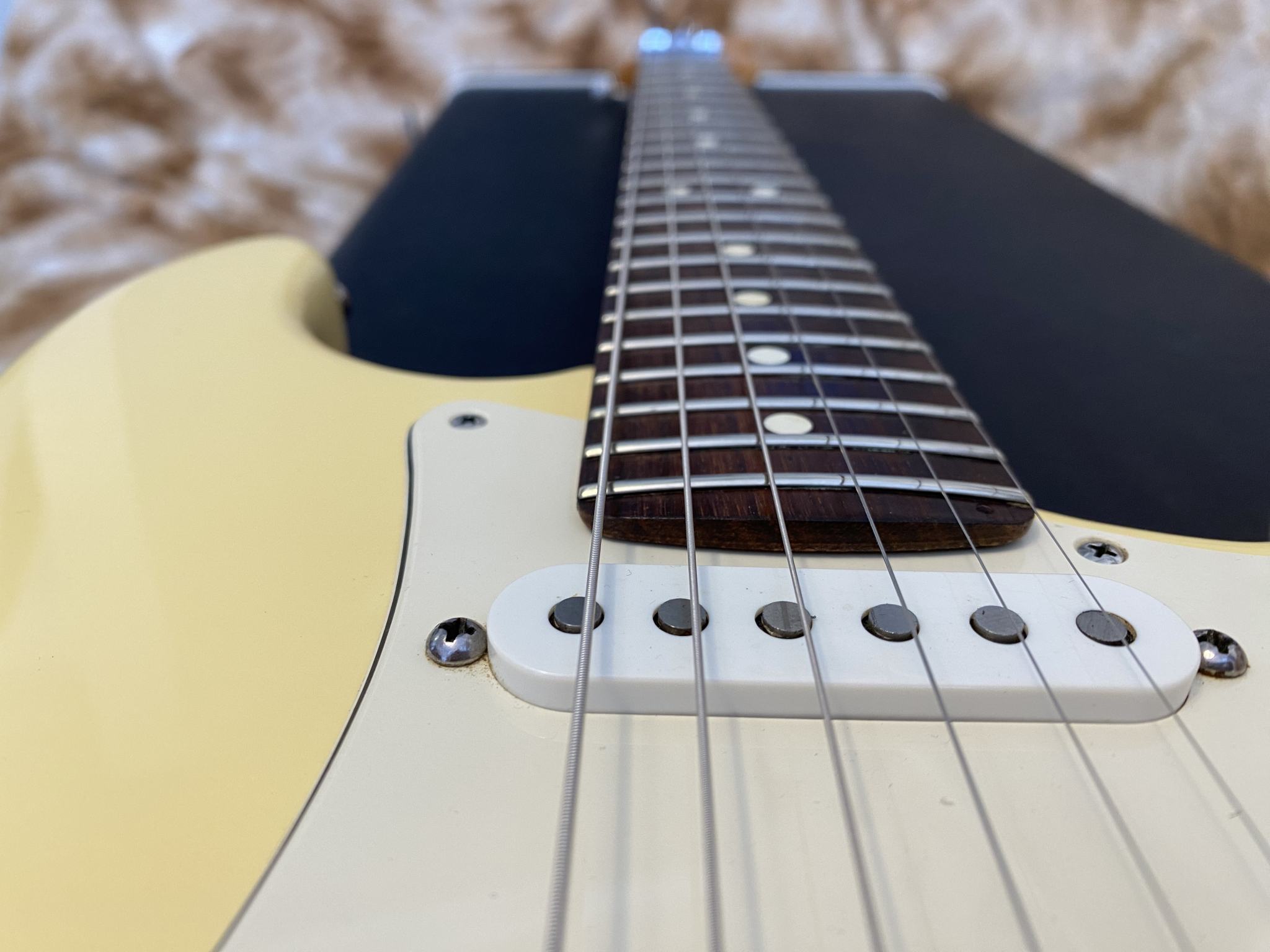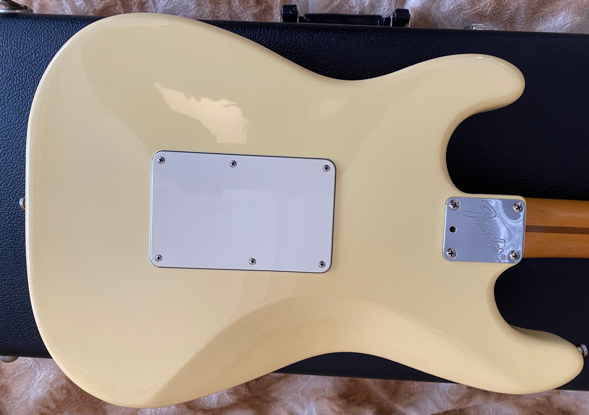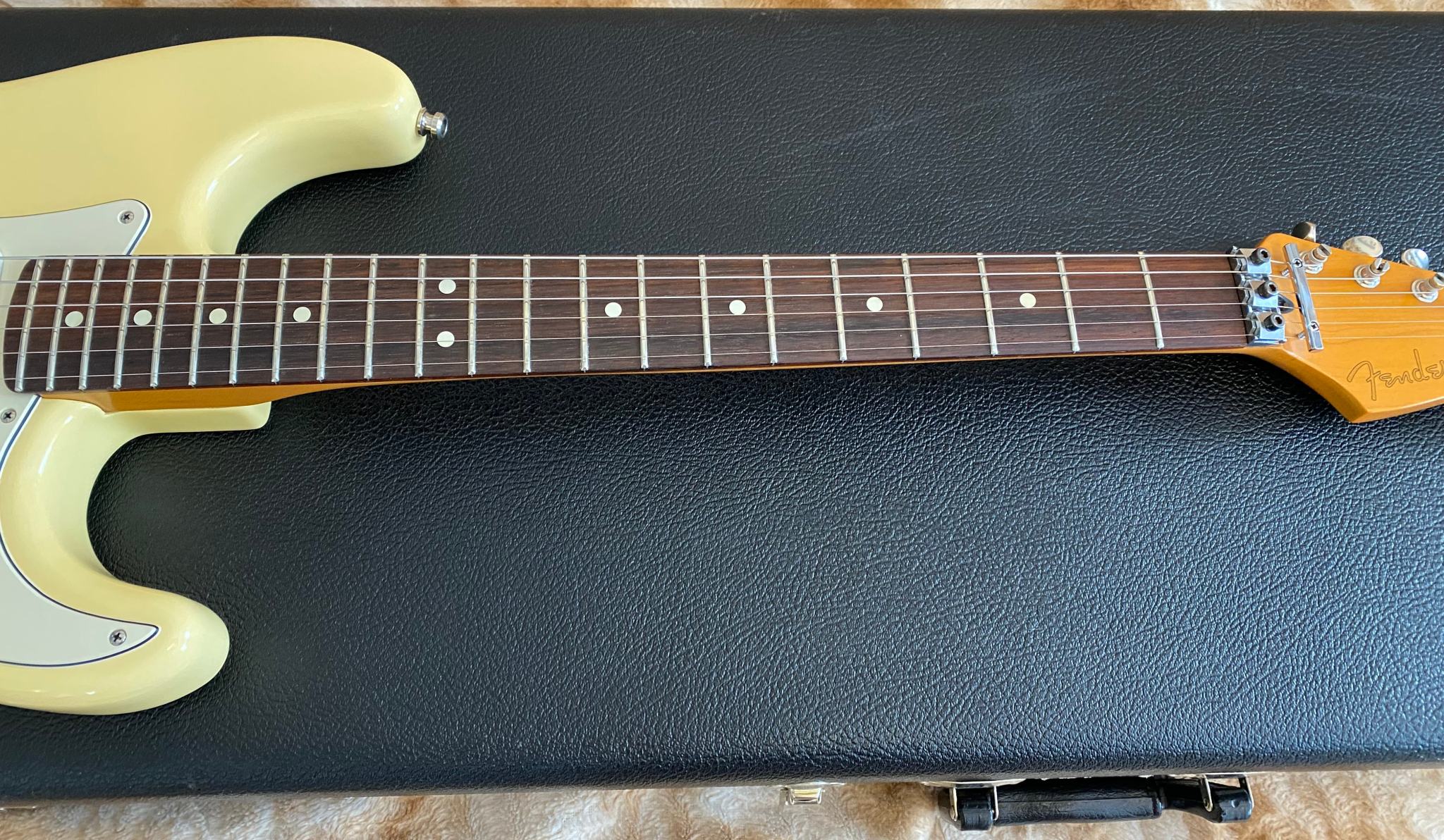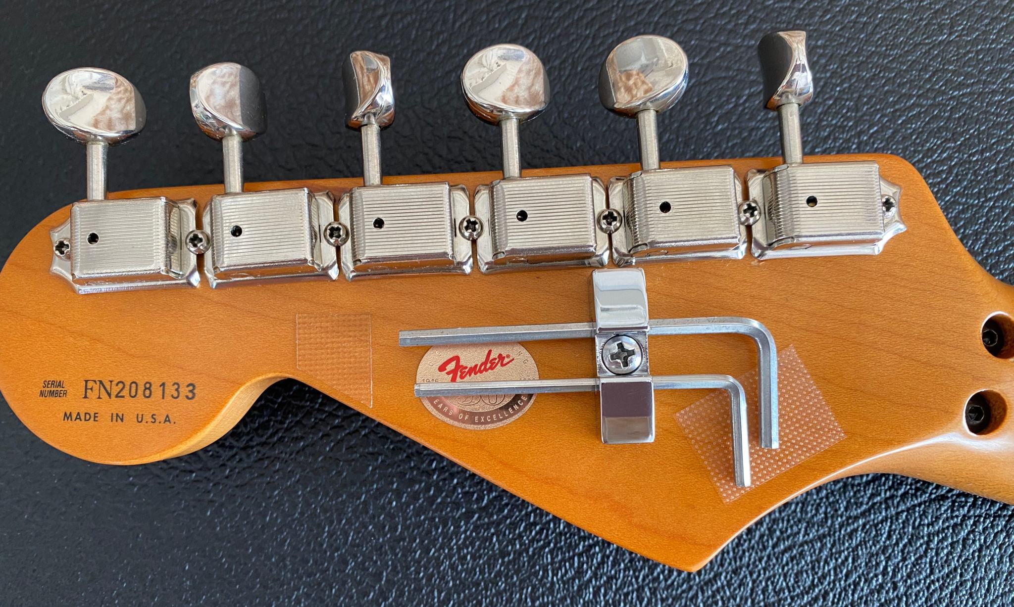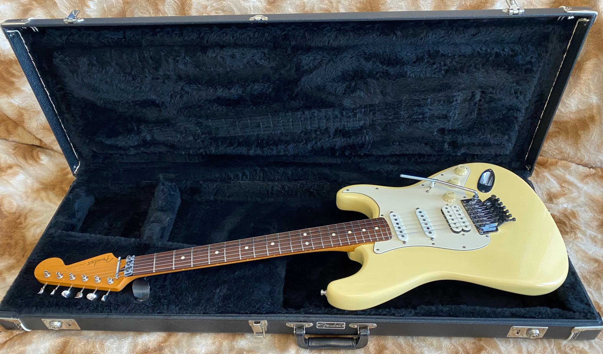 Fender Floyd Rose® Classic Stratocaster® made in USA -- Гитара сделана в Америке в марте 96-го года. В этом году Fender исполнилось 50 лет (1946-1996) и эта модель стала одной из тех, которая была выпущена специальным юбилейным тиражем. Основным отличием таких инструментов от обычных серийных является более тщательная работа по установке ладов и всего что с этим связано (в спецификациях обозначается как "Highly Detailed Fret Work"). Изюминкой гитары является установка “Original Floyd Rose” и некового звукоснимателя Хамбакер DiMarzio® Custom PAF Pro в бриджевой позиции. На данный момент в Америке данная модель уже не выпускается (производство перенесено в Мексику)