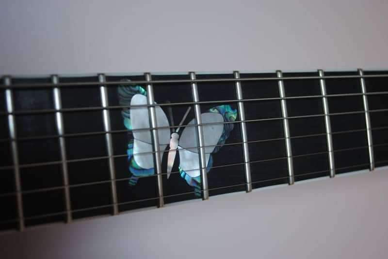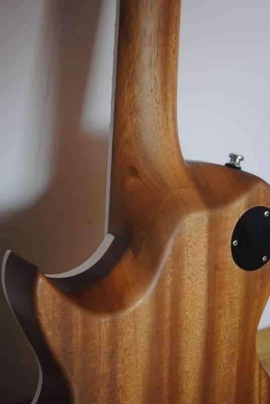 Красное дерево,вклеенный гриф,накладка эбони, инкрустрация перламутром на 12 ладу,локовые колки.