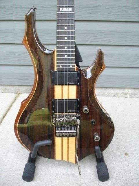 Производитель: ESP LtdМодель: F-2E (не путать с бютжетными сериями типа F-50, F-400 и т.д.)Тип товара: ЭлектрогитараМатериал корпуса: Красное дерево + Эбеновый топ (не декоративный 1мм шпон, а полноценная прослойка дерева)Количество ладов: 24Тип ладов: MediumКонструкция грифа: Сквозной 5 слойный, разнонаправленныйПрофиль грифа: Особо тонкий U-образныйМензура (дюймы): 25 1/2Фурнитура: Черная никелированная (включая крутилки и рамки звучков) Gotoh™Материал грифа: Клен\Махагони, 5 слоевВерхний порожек: Запирающий Gotoh™Накладка на гриф: Черное дерево (Эбен)Ширина на последнем ладу (мм): 57Ширина у верхнего порожка (мм): 42Колки: Gotoh™Машинка (бридж): Gotoh™Управление: Громкость / тембр / 3-позиционный переключатель и ОТСЕЧКА на синглы !!!Звукосниматели: ESP LH-301 и LH-300 (вместо стандартных LH-150).Инкрустация: Точки из натурального перламутраСтрой держит просто на ура. При не очень частой игре и не очень частой игре флойдом строй держит 5-6 месяцев.Звук качественный, богатый, насыщенный, певучий. Очень хорошо себя показывает и в дезметале, и в чистом канале.Обмен на страт.