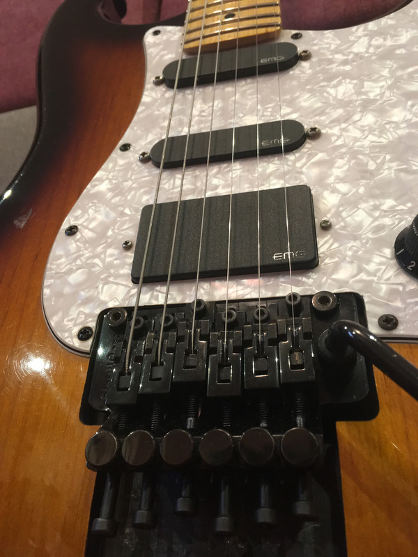 Очень профессионально установлен Floyd Rose Original Made in Germany by Shaller+Top Lock ; - Колки заменены на Gotoh; - Установлены датчики EMG KH20 (Kirk Hammett set) - 81-SA-SA(Батарейка находится под пикгардом,между ручками тона и громкости). Установлены потайные стрэплоки Dunlop.Корпус-Американская ольха,гриф-цельный клён без накладки.