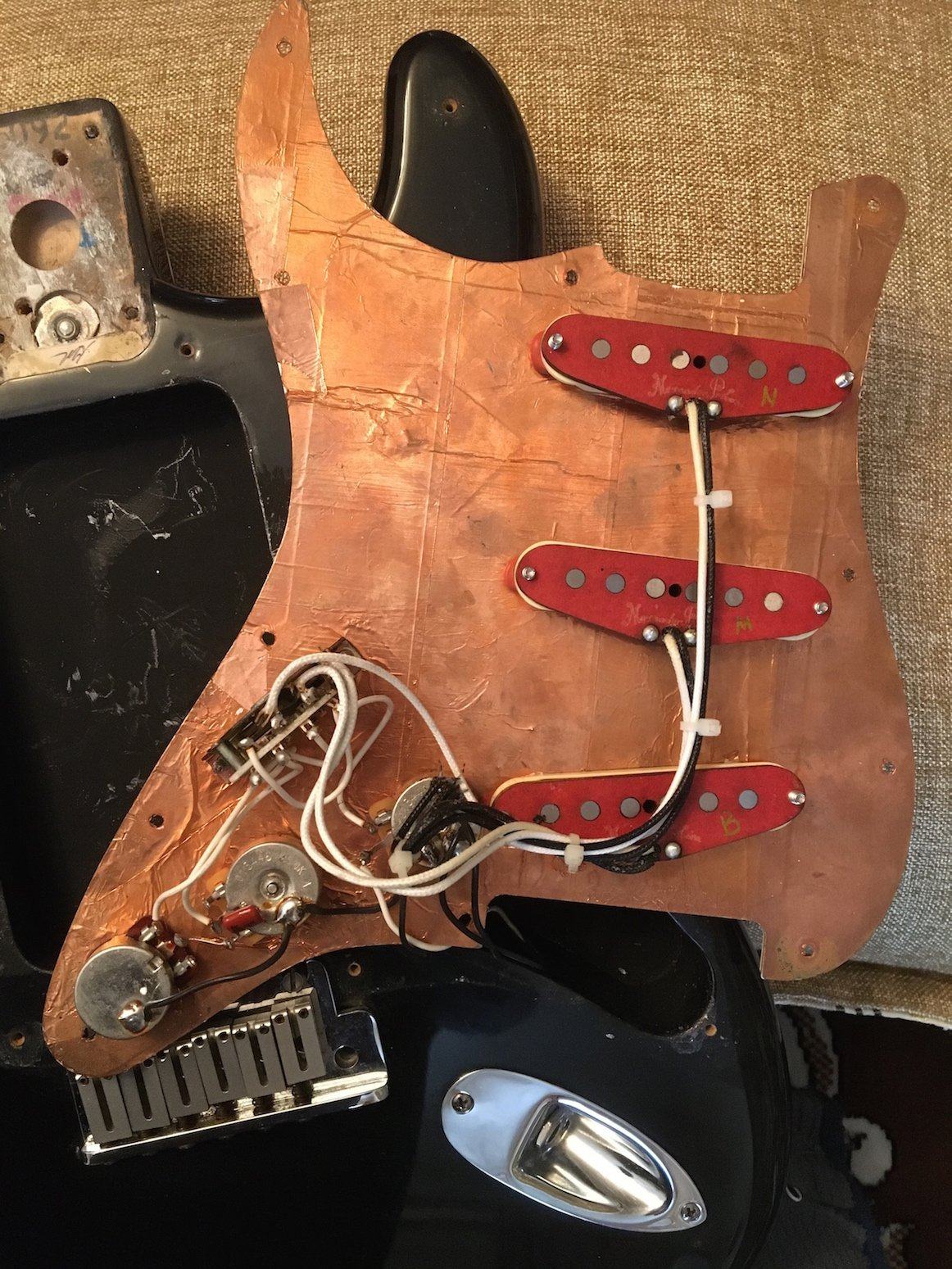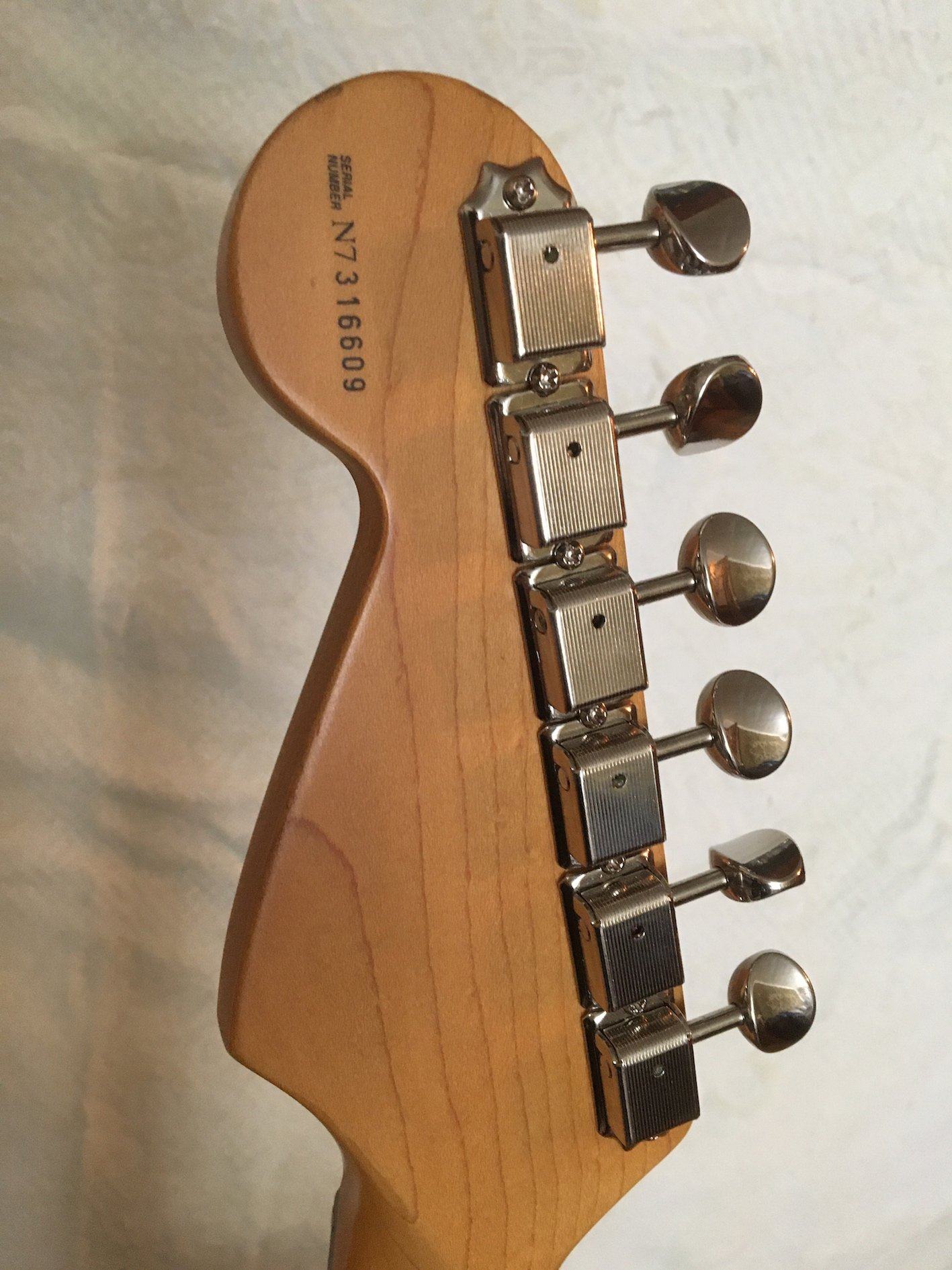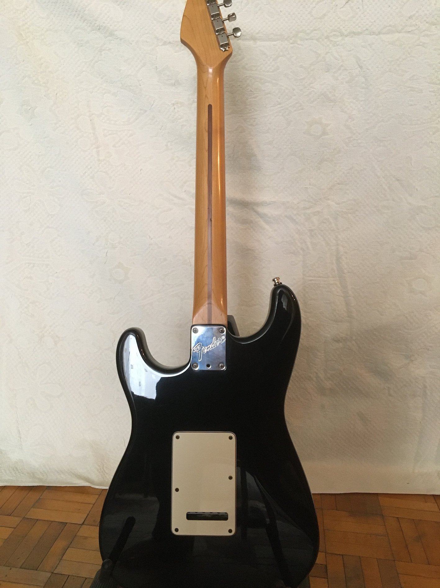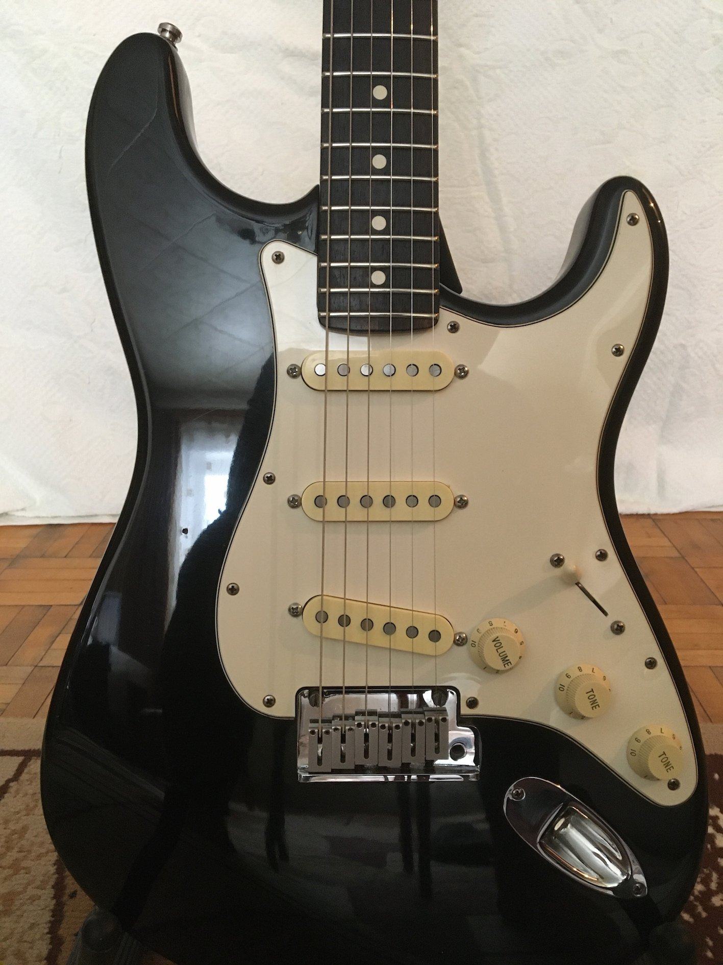 Продам классный Fender American Standard Strat 1998 года, в очень хорошем состоянии, благородного чёрного цвета, дека ольха, гриф - клён/палисандр. Палисандр - шикарного тёмного цвета, как на настоящих винтажах, или дорогих кастомах. Звукосниматели - Alexander Pribora Voodoo pickup set - отличные звукосниматели, гораздо интереснее и живее стоковых Noiseless N3. Сделана медная экранировка, графитовая экранировка в полостях. Гитара в очень хорошем состоянии, косметика на 5 с маленьким минусом, есть мелкие царапинки и вмятинки, в целом всё очень хорошо выглядит, гриф и лады в отличном состоянии. Анкер закручен до упора, но небольшой прогиб есть. В тембрблоке применена система “Delta Tone” - потенциометр тона на бриджевом и среднем датчике с опцией отключения из цепи в минимальной точке: (“Delta Tone” system includes high output bridge pickup and special No-Load tone control for Middle and Bridge Pickups). Бридж полностью стальной - пластина, сёдла, сустейн-блок. Колки очень крепкие и тугие. Деревяшка легкая, отзывчивая, флажолеты по всей мензуре, сумасшедший сустейн, играть можно часами, не хочется гитару из рук выпускать. В комплекте - новый чехол Fender, рычаг, шестигранник.