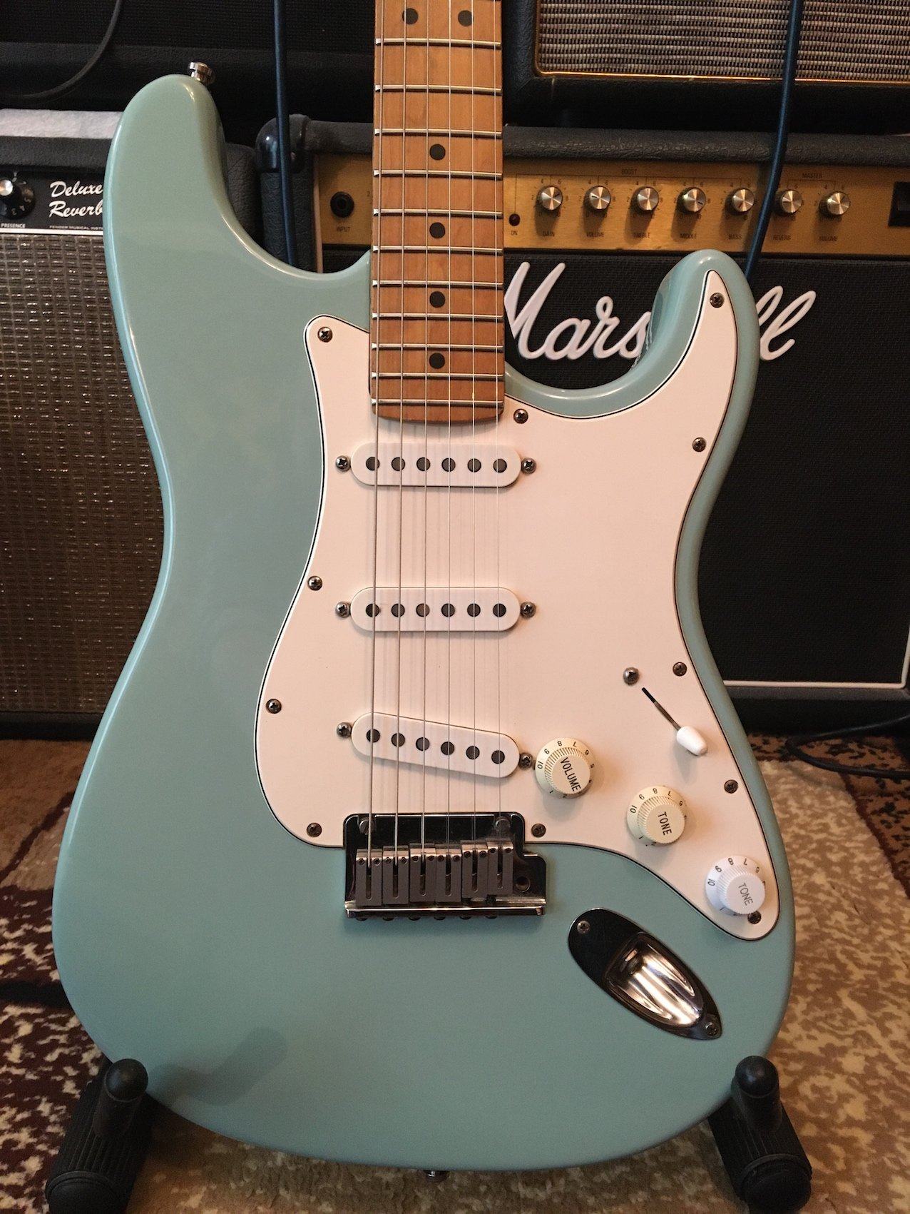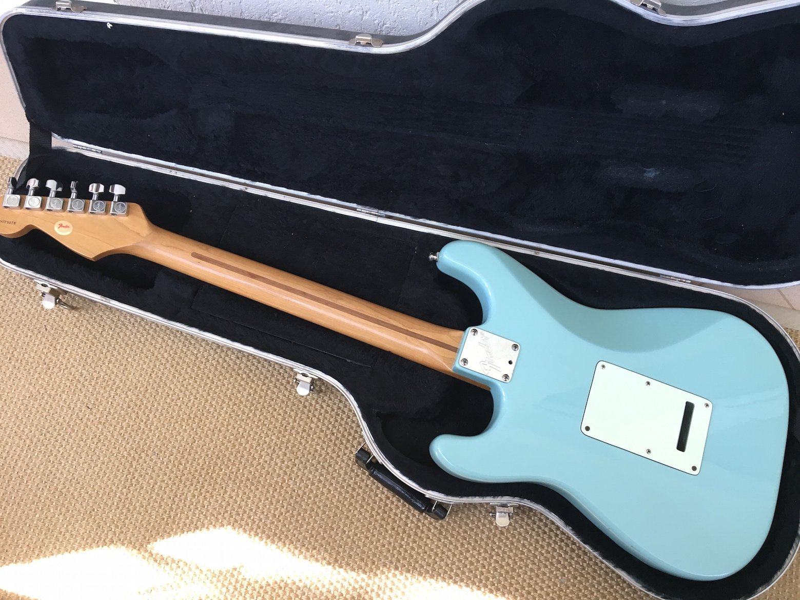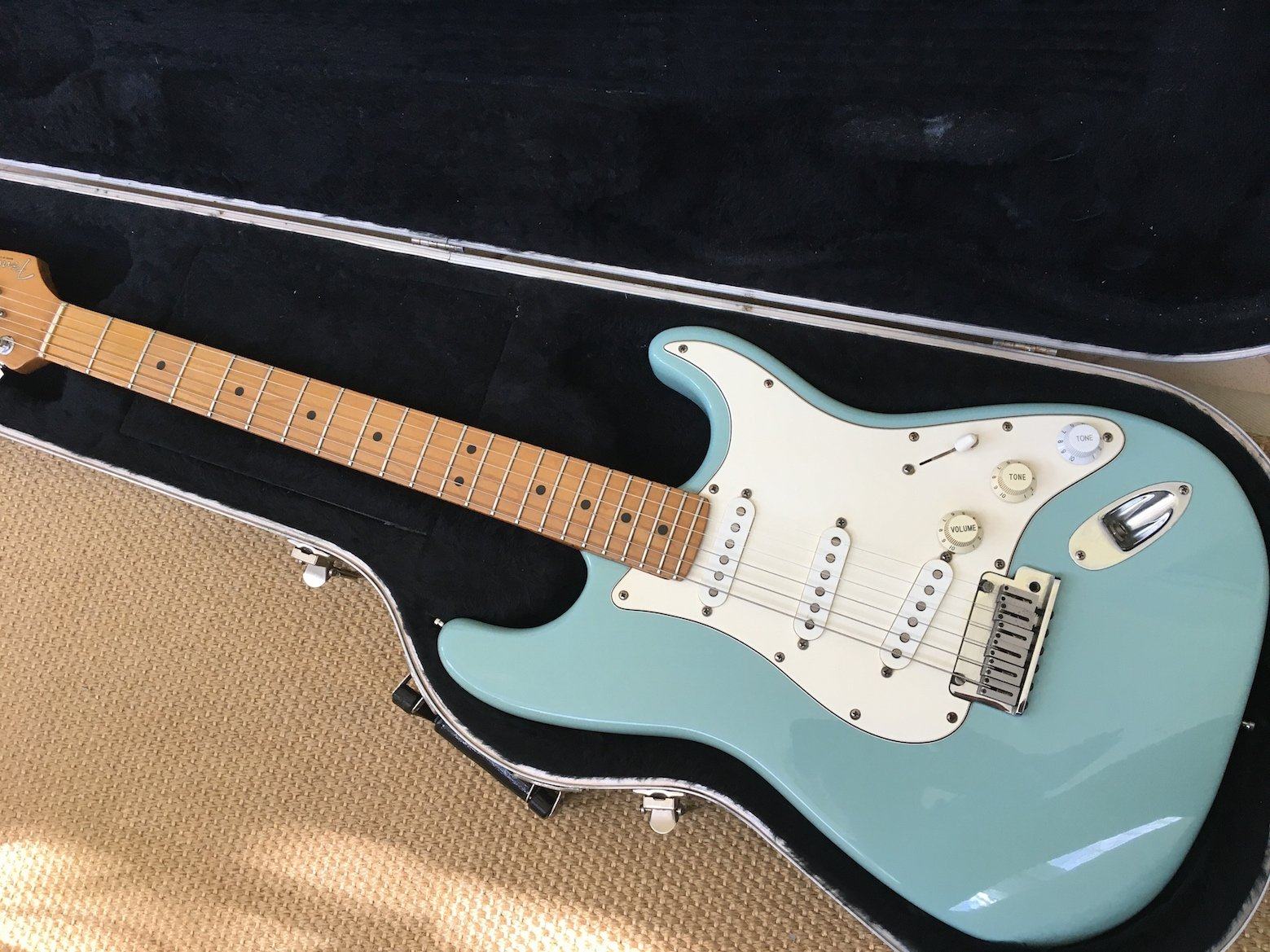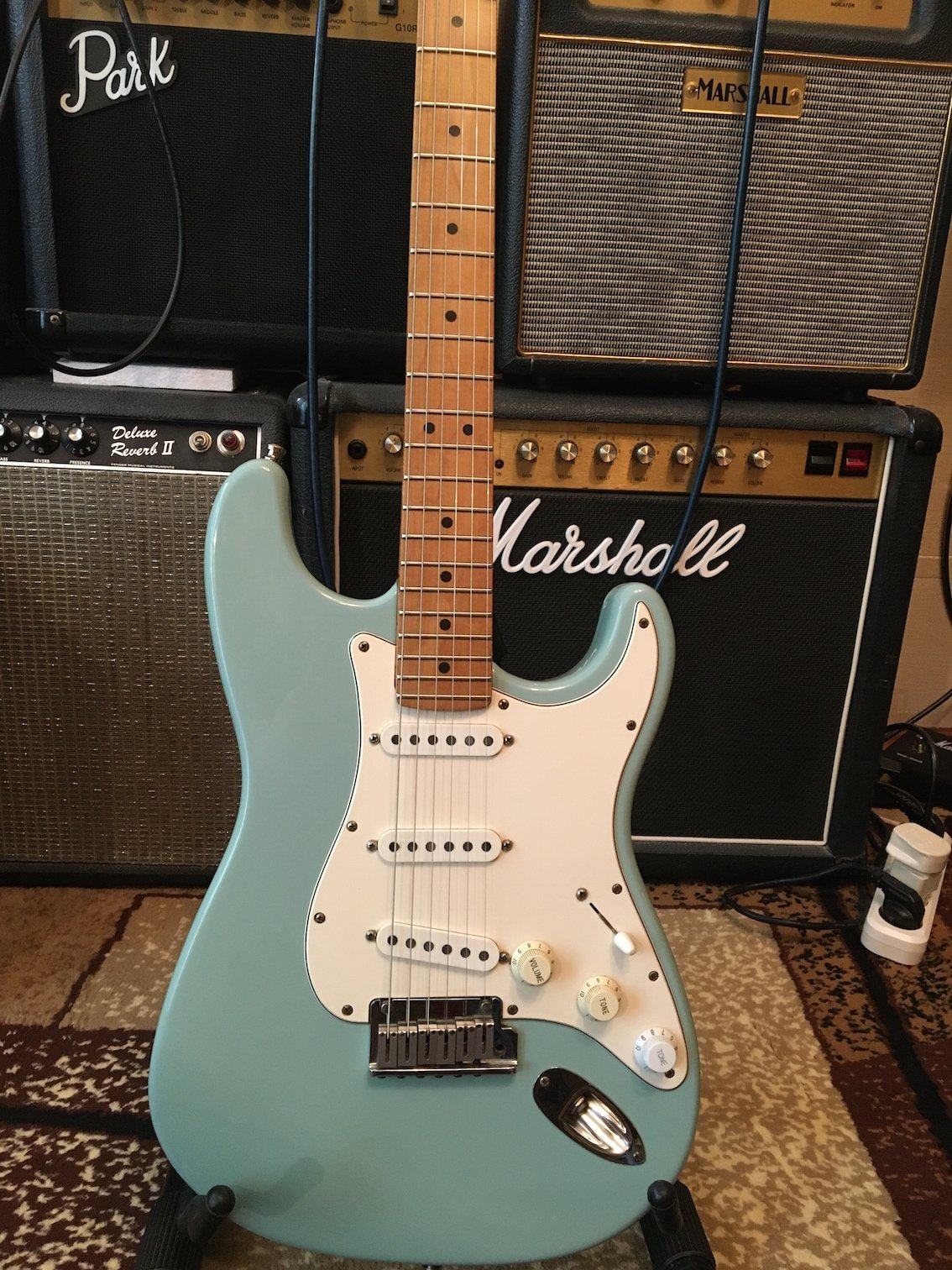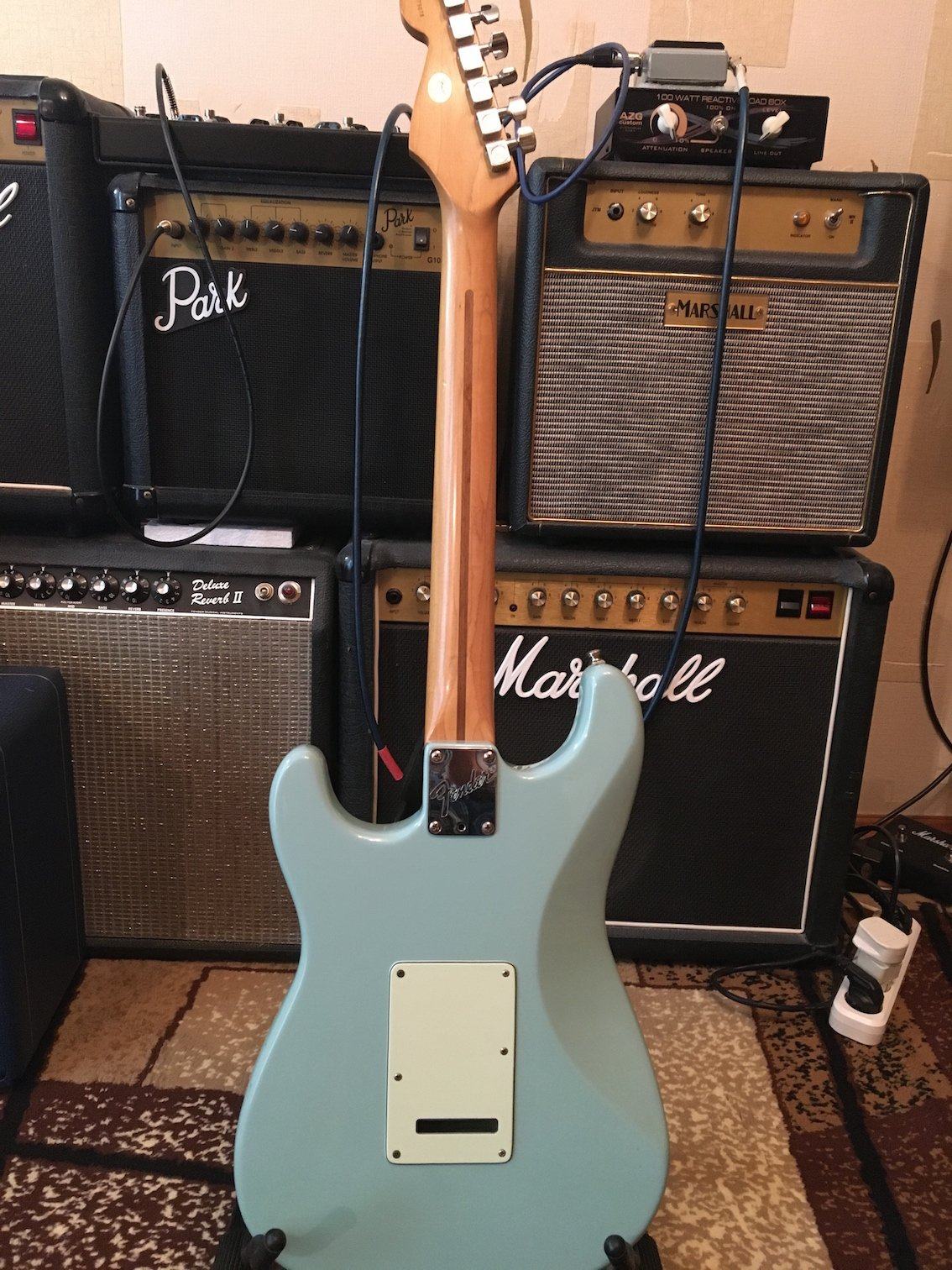 Продам классный, очень красивый Fender American Standard Stratocaster 1995г, юбилейная серия, в редком, шикарном цвете Sonic Blue. Гитара в отличном состоянии, косметика на 5, корпус ольха, гриф - клён, один кусок. Гриф, лады, анкер, электроника - всё в прекрасном рабочем состоянии, всё родное, всё работает идеально. В тембрблоке стоит TBX Tone Control, специально для любителей Клэптона)). Звук - супер, но будьте осторожны, об него можно пальцы порезать)). С учётом того, что камера всё-таки не передаёт полностью всю глубину и насыщенность звука, красоту обертонов, всё равно прекрасно слышно фирменную фендеровскую породу и мощь. В комплекте родной кейс, рычаг, запасная ручка тона.
